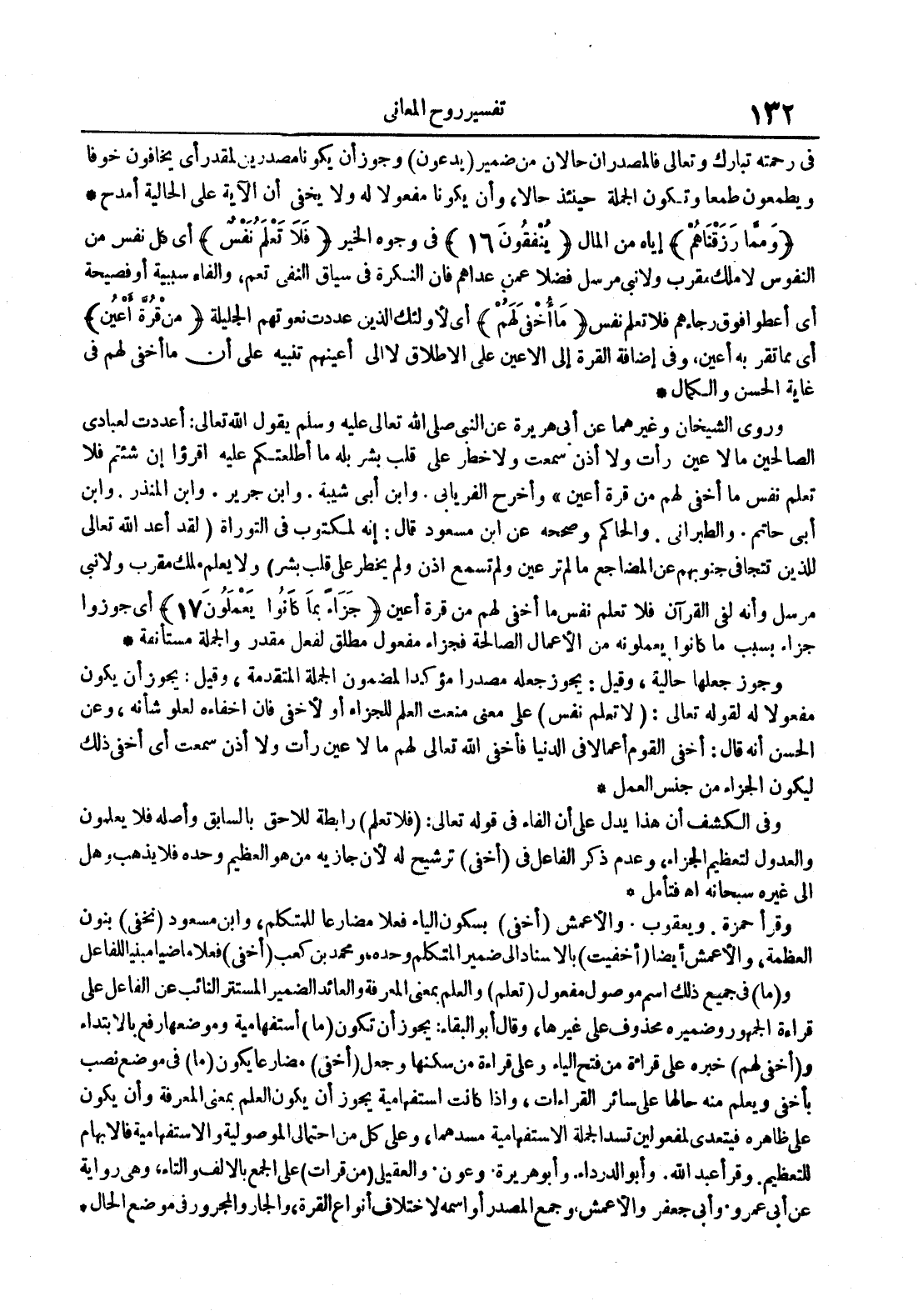 وقرأ حمزة ويعقوب والأعمش أخفى بسكون الياء فعلا مضارعا للمتكلم وإبن مسعود نخفي بنون العظمة والأعمش أيضا أخفيت بالإسناد إلى ضمير المتكلم وحده ومحمد بن كعب أخفى فعلا ماضيا مبنيا للفاعل و ما في جميع ذلك أسم موصول مفعول تعلم والعلم بمعنى المعرفة والعائد الضمير المستتر النائب عن الفاعل على قراءة الجمهور وضميره محذوف على غيرها وقال أبو البقاء : يجوز أن تكون ما أستفهامية وموضعها رفع بالإبتداء و أخفى لهم خبره على قراءة من فتح الياء وعلى قراءة من سكنها وجعل أخفى مصارعا يكون ما في موضع نصب بأخفى ويعلم منه حالها على سائر القراءات وإذا كانت إستفهامية يجوز أن يكون العلم بمعنى المعرفة وأن يكون على ظاهره فيتعدى لمفعولين تسد الجملة الإستفهامية مسدهما وعلى كل من إحتمال الموصولية والإستفهامية فالإبهام للتعظيم وقرأ عبدالله وأبو الدرداء وأبو هريرة وعون والعقيلي من قرأت على الجمع بالألف والتاء وهي رواية عن أبي عمرو وأبي جعفر والأعمش وجمع المصدر أو أسمه لإختلاف أنواع القرة والجار والمجرور في موضع الحال