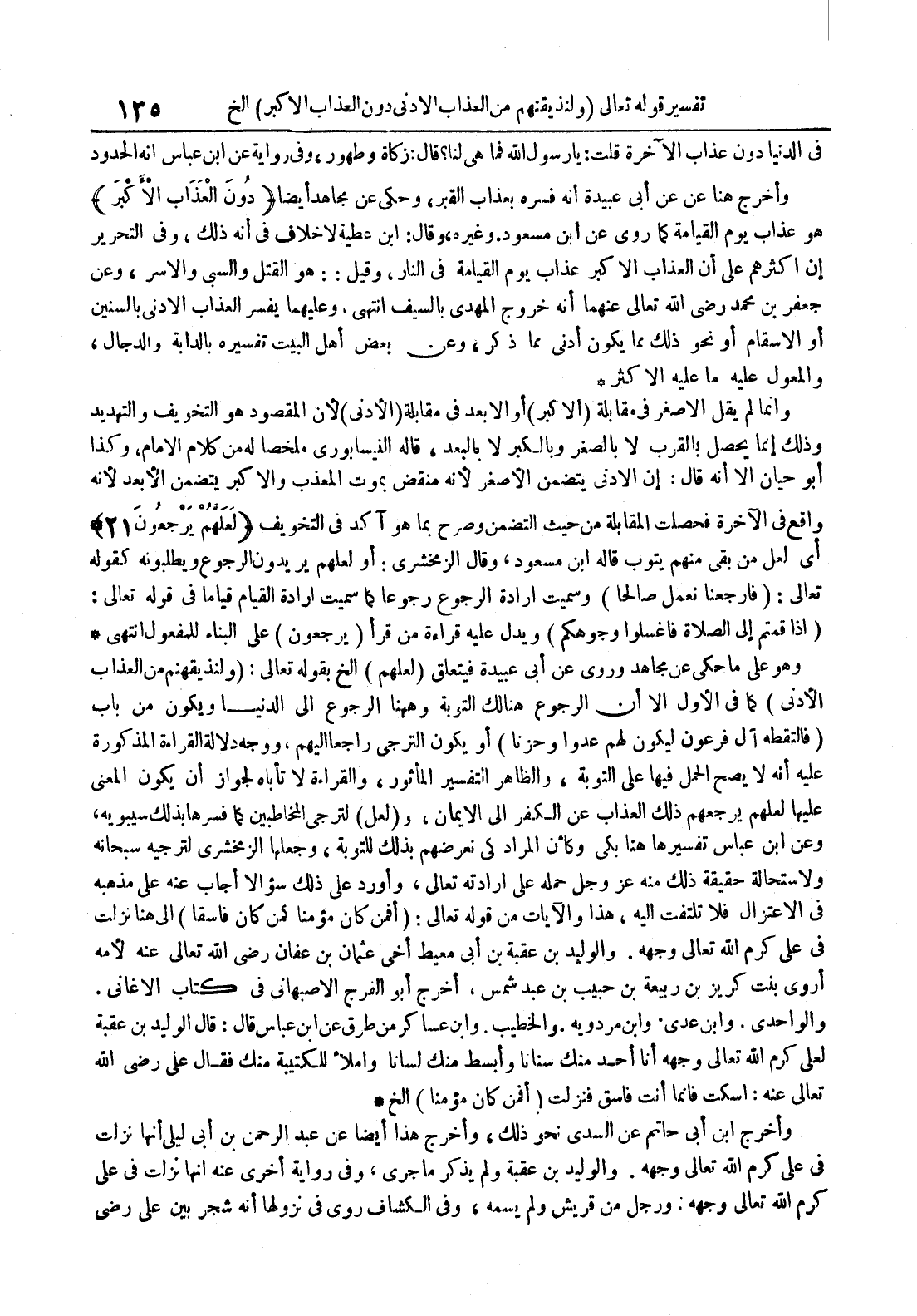 وإنما لم يقل الأصغر في مقابلة الأكبر أو الأبعد في مقابلة الأدنى لأن المقصود هو التخويف والتهديد وذلك إنما يحصل بالقرب لا بالصغر وبالكبر لا بالبعد قاله النيسابوري ملخصا له من كلام الإمام وكذا أبو حيان إلا أنه قال : إن الأدنى يتضمن الأصغر لأنه منقض بموت المعذب والأكبر يتضمن الأبعد لأنه واقع في الآخرة فحصلت المقابلة من حيث التضمن وصرح بما هو آكد في التخويف لعلهم يرجعون 12 أي لعل من بقي منهم يتوب قاله إبن مسعود وقال الزمخشري : أو لعلهم يريدون الرجوع ويطلبونه كقوله تعالى : فأرجعنا نعمل صالحا وسميت إرادة الرجوع رجوعا كما سميت إرادة القيام قياما في قوله تعالى : إذا قمتم إلى الصلاة فأغسلوا وجوهكم ويدل عليه قراءة من قرأ يرجعون على البناء للمفعول إنتهى
