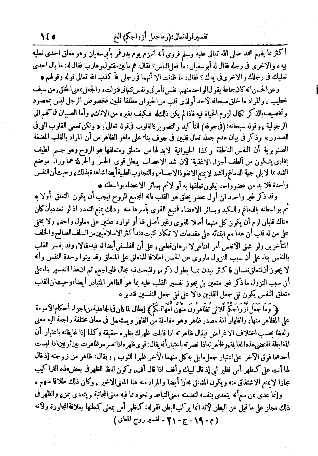 وقد ذكر غير واحد أن أول عضو يخلق هو القلب فإنه المجمع للروح فيجب أن يكون التعلق أولا به ثم بواسطته بالدماغ والكبد وبسائر الأعضاء فمنبع القوى بأسرها منه وذلك يمنع التعدد إذ لو تعدد بأن كان هناك قلبان لزم أن يكون كل منهما أصلا للقوى وغير اصل لها أو توارد علتين على معلول واحد ولا يخفى على من له قلب أن هذا مع إبتنائه على مقدمات لا تكاد تثبت عند أكثر الإسلاميين من السلف الصالح والخلف المتأخرين ولو بشق الأنفس أمر إقناعي لا برهان قطعي على أن للفلسفي أيضا له فيه مقالا وقد يفسر القلب بالنفس بناء على أن سب النزول ما روى عن الحسن إطلاقا للمتعلق على المتعلق وقد بينوا وحدة النفس وأنه لا يجوز أن تتعلق نفسان فأكثر ببدن بما يطول ذكره وللبحث فيه مجال فليراجع ثم إن هذا التفسير بناء على أن سبب النزول ما ذكر غير متعين بل يجوز تفسير القلب عليه بما هو الظاهر المتبادر أيضا وحيث أن القلب متعلق النفس يكون نفي جعل القلبين دالا على نفي جعل النفسين فتدبر