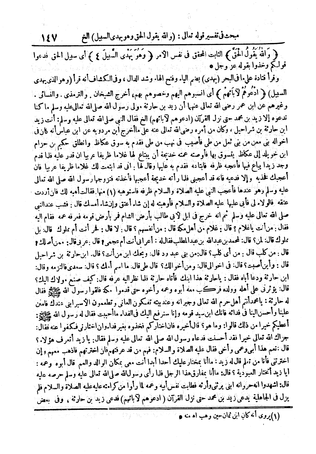 وقرأ قتادة على ما في البحر يهدي بضم الياء وفتح الهاء وشد الدال وفي الكشاف أنه قرأ وهو الذي يهدي السبيل أدعوهم لآبائهم أي أنسبوهم إليهم وخصوهم بهم أخرج الشيخان والترمذي والنسائي وغيرهم عن إبن عمر رضي الله تعالى عنهما أن زيد بن حارثة مولى رسول الله صلى الله تعالى عليه وسلم ما كنا ندعوه إلا زيد بن محمد حتى نزل القرآن أدعوهم لآبائهم إلخ فقال النبي صلى الله تعالى عليه وسلم : أنت زيد إبن حارثة بن شراحيل وكان من أمره رضي الله تعالى عنه على ما أخرج إبن مردويه عن إبن عباس أنه كان في أخواله بني معن من بني ثعل من طي فأصيب في نهب من طي فقدم به سوق عكاظ وأنطلق حكيم بن حزام إبن خويلد إلى عكاظ يتسوق بها فأوصته عمته خديجة أن يبتاع لها غلاما ظريفا عربيا إن قدر عليه فلما قدم وجد زيدا يباع فيها فأعجبه ظرفه فأبتاعه فقدم به عليها وقال لها : إني قد أبتعت لك غلاما ظريفا عربيا فإن أعجبك فخذيه وإلا فدعيه فإنه قد أعجبني فلما رأته خديجة أعجبها فأخذته فتزوجها رسول الله صلى الله تعالى عليه وسلم وهو عندها فأعجب النبي عليه الصلاة و السلام ظرفه فأستوهبه منها فقالت أهبه لك فإن أردت عقته فالولاء لي فأبى عليها عليه الصلاة و السلام فأوهبته له إن شاء أعتق وإن شاء أمسك قال : فشب عند النبي صلى الله تعالى عليه وسلم ثم إنه خرج في إبل لأبي طالب بأرض الشام فمر بأرض قومه فعرفه عمه فقام إليه فقال : من أنت ياغلام قال : غلام من أهل مكة قال : من أنفسهم قال : لا قال : فحر أنت أم مملوك قال : بل مملوك قال : لمن قال : لمحمد بن عبدالله بن عبدالمطلب فقال له : أعرابي أنت أم عجمي قال : عربي قال : ممن أصلك قال : من كلب قال : من أي كلب قال : من بني عبد ود قال : ويحك إبن من أنت قال : إبن حارثة بن شراحيل قال : وأين أصبت قال : في أخوالي قال : ومن أخوالك قال طي قال : ما أسم أمك قال : سعدى فالتزمه وقال : إبن حارثة ودعا أباه فقال : ياحارثة هذا إبنك فأتاه حارثة فلما نظر إليه عرفه قال : كيف صنع مولاك إليك قال : يؤثرني على أهله وولده فركب معه أبوه وعمه وأخوه حتى قدموا مكة فلقوا رسول الله فقال له حارثة : يامحمد أنتم أهل حرم الله تعالى وجيرانه وعند بيته تفكون العاني وتطعمون الأسير إبني عندك فأمنن علينا وأحسن إلينا في فدائه فإنك إبن سيد قومه وإنا سنرفع إليك في الفداء ما أحببت فقال له رسول الله : أعطيكم خيرا من ذلك قالوا : وما هو قال أخيره فإن إختاركم فخذوه بغير فداء وإن إختارني فكفوا عنه فقال : جزاك الله تعالى خيرا فقد أحسنت فدعاه رسول الله صلى الله تعالى عليه وسلم فقال : يازيد أتعرف هؤلاء قال : نعم هذا أبي وعمي وأخي فقال عليه الصلاة و السلام : فهم من قد عرفتهم فإن أخترتهم فأذهب معهم وإن أخترتني فأنا من تعلم قال له زيد : ما أنا بمختار عليك أحدا أبدا أنت معي بمكان الوالد والعم قال أبوه وعمه : أيا زيد أتختار العبودية قال : ما أنا بمفارق هذا الرجل فلما رأى رسول الله صلى الله تعالى عليه وسلم حرصه عليه قال : أشهدوا إنه حر وإنه إبني يرثني وأرثه فطابت نفس أبيه وعمه لما رأوا من كرامته عليه عليه الصلاة و السلام فلم يزل في الجاهلية يدعى زيد بن محمد حتى نزل القرآن أدعوهم لآبائهم فدعى زيد بن حارثة وفي بعض
