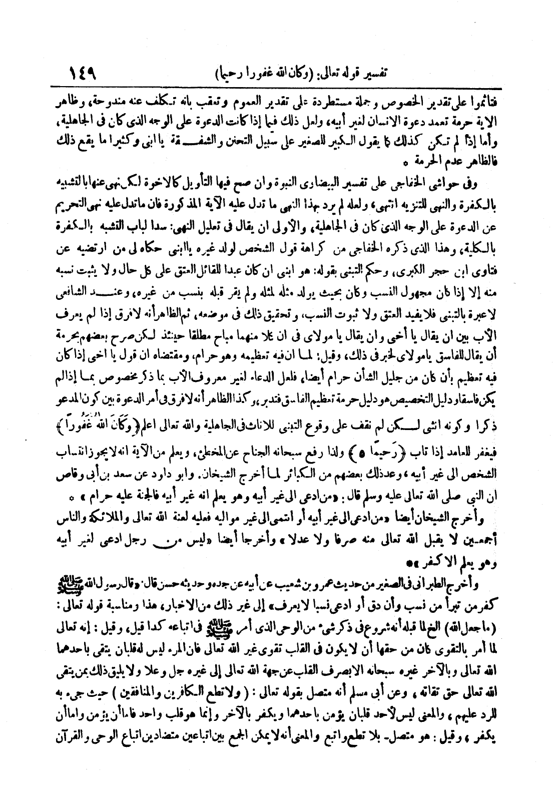 وفي حواشي الخفاجي على تفسير البيضاوي النبوة وإن صح فيها التأويل كالأخوة لكن نهى عنها بالتشبيه بالكفرة والنهي للتنزيه إنتهى ولعله لم يرد بهذا النهي ما تدل عليه الآية المذكورة فإن ما تدل عليه نهى التحريم عن الدعوة على الوجه الذي كان في الجاهلية والأولى أن يقال في تعليل النهي : سدا لباب التشبه بالكفرة بالكلية وهذا الذي ذكره الخفاجي من كراهة قول الشخص لولد غيره ياإبني حكاه لي من أرتضيه عن فتاوي إبن حجر الكبرى وحكم التبني بقوله : هو إبني إن كان عبدا للقائل العتق على كل حال ولا يثبت نسبه منه إلا إذا كان مجهول النسب وكان بحيث يولد مثله لمثله ولم يقر قبله بنسب من غيره وعند الشافعي لا عبرة بالتبني فلا يفيد العتق ولا ثبوت النسب وتحقيق ذلك في موضعه ثم الظاهر أنه لا فرق إذا لم يعرف الأب بين أن يقال ياأخي وإن يقال ياكولاي في أن كلا منهما مباح مطلقا حينئذ لكن صرح بعضهم بحرمة أن يقال للفاسق يامولاي لخبر في ذلك وقيل : لما أن فيه تعظيمه وهو حرام ومقتضاه أن قول ياأخي إذا كان فيه تعظيم بأن كان من جليل الشأن حرام أيضا فلعل الدعاء لغير معروف الأب بما ذكر مخصوص بما إذا لم يكن فاسقا ودليل التخصيص هو دليل حرمة تعظيم الفاسق فتدبر وكذا الظاهر أنه لا فرق في أمر الدعوة بين كون المدعو ذكرا وكونه إنثى لكن لم نقف على وقوع التبني للإناث في الجاهلية والله تعالى أعلم وكان الله غفورا فيغفر للعامد إذا تاب رحيما 5 ولذا رفع سبحانه الجناح عن المخطيء ويعلم من الآية أنه لا يجوز إنتساب الشخص إلى غير أبيه وعد ذلك بعضهم من الكبائر لما أخرج الشيخان وأبو داؤد عن سعد بن أبي وقاص أن النبي صلى الله تعالى عليه وسلم قال : من إدعى إلى غير أبيه وهو يعلم أنه أبيه فالجنة عليه حرام