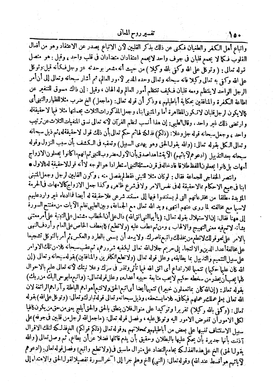 وأنتصر الخفاجي للجماعة فقال : لو كان مثلا للتبني فقط لم يفصل منه وكون القلبين لرجل وجعل المتبني إبنا في جميع الأحكام مما لا حقيقة له في نفس الأمر ولا في شرع ظاهر وكذا جعل الأزواج كالأمهات في الحرمة المؤبدة مطلقا من مخترعاتهم التي لم يستندوا فيها إلى مستند شرعي فلا حقيقة له أيضا فما أدعاه غير وارد عليهم لا سيما مع مخالفته لما روى عنهم إنتهى ويد الله تعالى مع الجماعة وبين الطيبي نظم الآيات من مفتتح السورة إلى ههنا فقال : إن الإستهلال بقوله تعالى : ياأيها النبي أتق الله دال على أن الخطاب مشتمل على التبنية على أمر معتني بشأنه لائح فيه معنى التهييج والإلهاب ومن ثم عطف عليه ولا تطع كما يعطف الخاص على العام وأردف النهي بالأمر على نحو قولك لا تطع من يخذلك وأتبع ناصرك ولا يبعد أن يسمى بالطرد والعكس ثم أمر بالتوكل تشجيعا على مخالفة أعداء الدين والإلتجاء إلى حريم جلال الله تعالى ليكفيه شرورهم ثم عقب سبحانه كلا من تلك الأوامر على سبيل التتميم والتذييل بما يطابقه وعلل قوله تعالى ولا تطع الكافرين والمنافقين بقوله سبحانه وتعالى وإن الله كان عليما حكيما تتميما للإرتداع أي أتق الله فيما تأتي وتذر في سرك وعلانيتك لأنه تعالى عليم بالأحوال كلها يجب أن يحذر من سخطه حكيم لا يحب متابعة حبيبه أعداءه وعلل قوله تعالى : وأتبع ما يوحى إليك من ربك بقوله تعالى : إن الله كان بما تعملون خبيرا تتميما أيضا أي أتبع الحق ولا تتبع أهواءهم الباطلة وآراءهم الزائغة لأن الله تعالى يعلم عملك وعملهم فيكافيء كلا ما يستحقه وذيل سبحانه وتعالى قوله تبارك وتعالى : وتوكل على الله بقوله تعالى : وكفى بالله وكيلا تقريرا وتوكيدا عل ىمنوال فلأن ينطق بالحق والحق أبلج يعني من حق من يكون كافيا لكل الأمور أن تفوض الأمور إليه وتوكل عليه وفصل قوله تعالى : ما جعل الله لرجل من قلبين في جوفه على سبيل الإستئناف تنبيها على بعض من أباطيلهم وتمحلاتهم وقوله تعالى ذلكم قولكم إلخ فذلكة لتلك الأقوال آذنت بأنها جديرة بأن يحكم عليها بالبطلان وحقيق بأن يذم قائلها فضلا عن أن يطاع ثم وصل تعالى والله يقول الحق إلخ على هذه الفذلكة بجامع التضاد على منوال ما سبق في ولا تطع وأتبع وفصل قوله تعالى : أدعوهم لآبائهم هو أقسط عند الله وقوله تعالى : النبي إلخ وهلم جرا إلى آخر السورة تفصيلا لقول الحق والإهتداء إلى