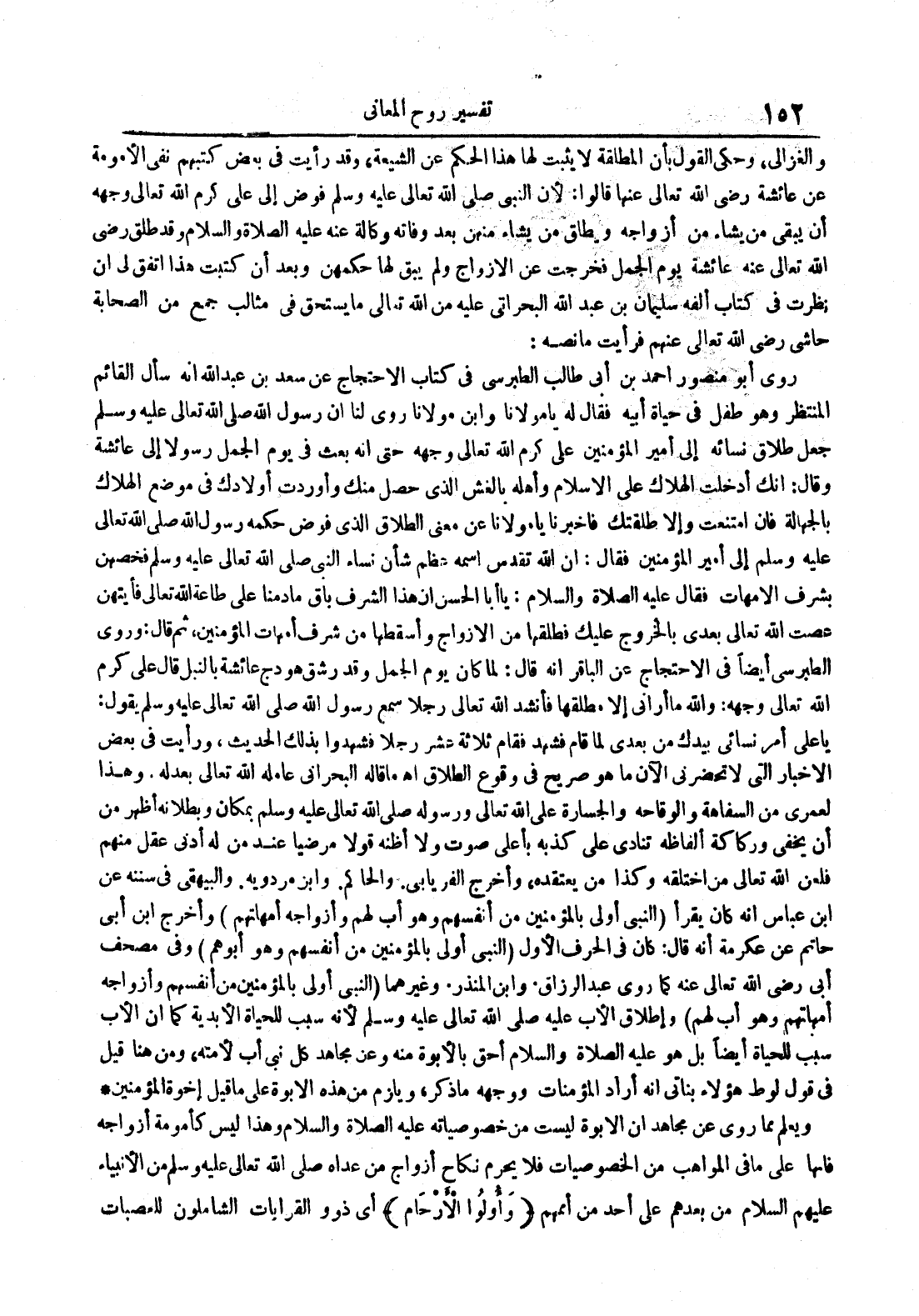 والغزالي وحكى القول بأن المطلقة لا يثبت لها هذا الحكم عن الشيعة وقد رأيت في بعض كتبهم نفي الأمومة عن عائشة رضي الله تعالى عنها قالوا : لأن النبي صلى الله تعالى عليه وسلم فوض إلى علي كرم الله تعالى وجهه أن يبقى من يشاء من أزواجه ويطلق من يشاء منهن بعد وفاته وكالة عنه عليه الصلاة و السلام وقد طلق رضي الله تعال ىعنه عائشة يوم الجمل فخرجت عن الأزواج ولم يبق لها حكمهن وبعد أن كتبت هذا أتفق لي أن نظرت في كتاب ألفه سليمان بن عبدالله البحراني عليه من الله تعالى ما يستحق في مثالب جمع من الصحابة حاشى رضي الله تعالى عنهم فرأيت ما نصه : روى أبو منصور أحمد بن أبي طالب الطبرسي في كتاب الإحتجاج عن سعد بن عبدالله أنه سأل القائم المنتظر وهو طفل في حياة أبيه فقال له يامولانا وإبن مولانا روى لنا أن رسول الله صلى الله تعالى عليه وسلم جعل طلاق نسائه إلى أمير المؤمنين علي كرم الله تعالى وجهه حتى أنه بعث في يوم الجمل رسولا إلى عائشة وقال : إنك أدخلت الهلاك على الإسلام وأهله بالغش الذي حصل منك وأوردت أولادك في موضع الهلاك بالجهالة فإن أمتنعت وإلا طلقتك فأخبرنا يامولانا عن معنى الطلاق الذي فوض حكمه رسول الله صلى الله تعالى عليه وسلم إلى أمير المؤمنين فقال : إن الله تقدس أسمه عظم شأن نساء النبي صلى الله تعالى عليه وسلم فخصهن بشرف الأمهات فقال عليه الصلاة و السلام : ياأبا الحسن إن هذا الشرف باق ما دمنا على طاعة الله تعالى فأيتهن عصت الله تعالى بعدي بالخروج عليك فطلقها من الأزواج وأسقطها من شرف أمهات المؤمنين ثم قال : وروى الطبرسي أيضا في الإحتجاج عن الباقر أنه قال : لما كان يوم الجمل وقد رشق هودج عائشة بالنبل قال علي كرم الله تعالى وجهه : والله ما أراني إلا مطلقها فأنشد الله تعالى رجلا سمع رسول الله صلى الله تعالى عليه وسلم يقول : ياعلي أمر نسائي بيدك من بعدي لما قام فشهد فقام ثلاثة عشر رجلا فشهدوا بذلك الحديث ورأيت في بعض الأخبار التي لا تحضرني الآن ما هو صريح في وقوع الطلاق ما قاله البحراني عامله الله تعالى بعدله وهذا لعمري من السفاهة والوقاحة والجسارة على الله تعالى ورسوله صلى الله تعالى عليه وسلم بمكان وبطلانه أظهر من أن يخفى وركاكة ألفاظه تنادي على كذبه بأعلى صوت ولا أظنه قولا مرضيا عند من له أدنى عقل منهم فلعن الله تعالى من أختلقه وكذا من يعتقده وأخرج الفريابي والحاكم وإبن مردويه والبيهقي في سننه عن إبن عباس أنه كان يقرأ النبي أولى بالمؤمنين من أنفسهم وهو أب لهم وأزواجه أمهاتهم وأخرج إبن أبي حاتم عن عكرمة أنه قال : كان في الحرف الأول النبي أولى بالمؤمنين من أنفسهم وهو أبوهم وفي مصحف أبي رضي الله تعالى عنه كما روى عبدالرزاق وإبن المنذر وغيرهما النبي أولى بالمؤمنين من أنفسهم وأزواجه أمهاتهم وهو أب لهم وإطلاق الأب عليه صلى الله تعالى عليه وسلم لأنه سبب للحياة الأبدية كما إن الأب سبب للحياة أيضا بل هو عليه الصلاة و السلام أحق بالأبوة منه وعن مجاهد كل نبي أب لأمته ومن هنا قيل في قول لوط هؤلاء بناتي أنه أراد المؤمنات ووجهه ما ذكر ويلزم من هذه الأبوة على ما قيل إخوة المؤمنين