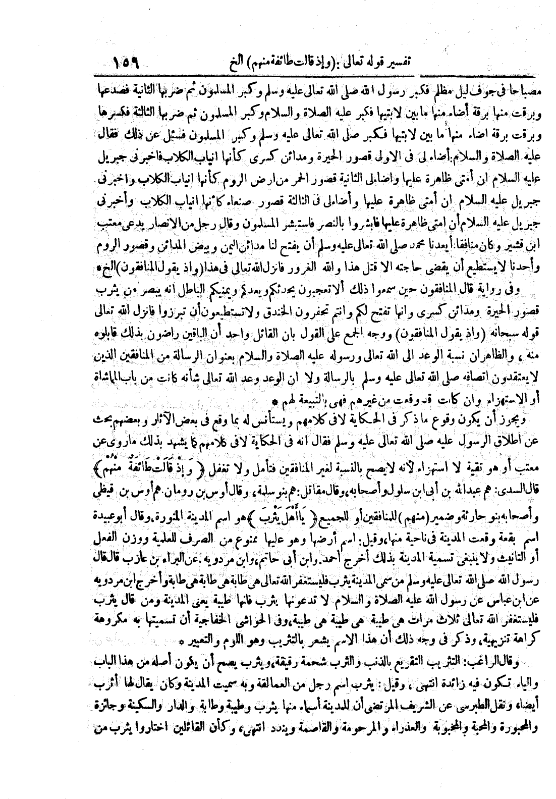 ويجوز أن يكون وقوع ما ذكر في الحكاية لا في كلامهم ويستأنس له بما وقع في بعض الآثار وبعضهم بحث عن إطلاق الرسول عليه صلى الله تعالى عليه وسلم فقال أنه في الحكاية لا في كلامهم كما يشهد بذلك ما روى عن معتب أو هو تقية لا إستهزاء لأنه لا يصح بالنسبة لغير المنافقين فتأمل ولا تغفل وإذ قالت طائفة منهم قال السدي : هم عبدالله بن أبي إبن سلول وأصحابه وقال مقاتل : هم بنو سلمة وقال أوس بن رومان هم أوس بن قيظي وأصحابه بنو حارثة وضمير منهم للمنافقين أو للجميع ياأهل يثرب هو أسم المدينة المنورة وقال أبو عبيدة أسم بقعة وقعت المدينة في ناحية منها وقيل : أسم أرضها وهو عليها ممنوع من الصرف للعلمية ووزن الفعل أو التأنيث ولا ينبغي تسمية المدينة بذلك أخرج أحمد وإبن أبي حاتم وإبن مردويه عن ابراء بن عازب قال قال رسول الله صلى الله تعالى عليه وسلم من سمى المدينة يثرب فليستغفر الله تعالى هي طابة هي طابة هي طابة وأخرج إبن مردويه عن إبن عباس عن رسول الله عليه الصلاة و السلام لا تدعونها يثرب فإنها طيبة يعني المدينة ومن قال يثرب فليستغفر الله تعالى ثلاث مرات هي طيبة هي طيبة هي طيبة وفي الحواشي الخفاجية أن تسميتها به مكروهة كراهة تنزيهية وذكر في وجه ذلك أن هذا الأسم يشعر بالتثريب وهو اللوم والتعيير