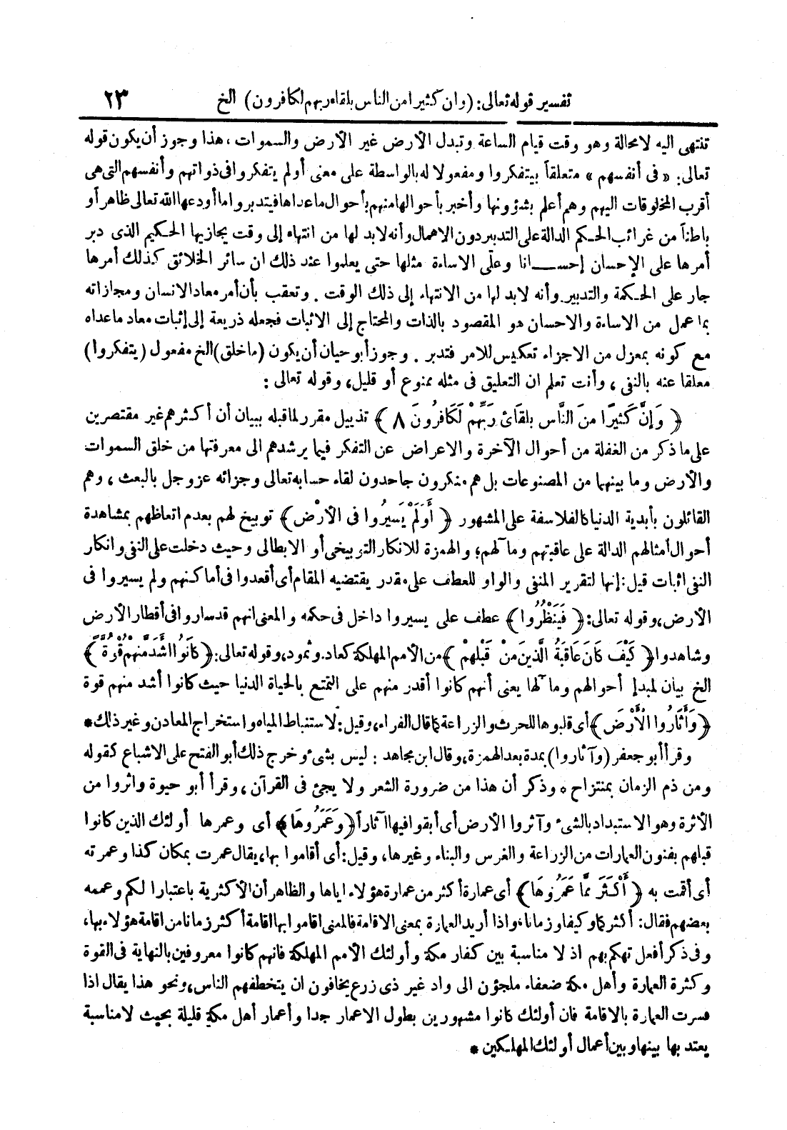 تنتهي إليه لا محالة وهو وقت قيام الساعة وتبدل الأرض غير الأرض والسموات هذا وجوز أن يكون قوله تعالى : في أنفسهم متعلقا بيتفكروا ومفعولا له بالواسطة على معنى أو لم يتفكروا في ذواتهم وأنفسهم التي هي أقرب المخلوقات إليهم وهم أعلم بشؤونها وأخبر بأحوالها منهم بأحوال ما عداها فيتدبروا ما أودعها الله ظاهرا وباطنا من غرائب الحكم الدالة على التدبير دون الإهمال وأنه لا بد لها من إنتهاء إلى وقت يجازيها الحكيم الذي دبر أمرها على الإحسان إحسانا وعلى الإساءة مثلها حتى يعلموا عند ذلك أن سائر الخلائق كذلك أمرها جار على الحكمة والتدبير وأنه لا بد لها من الإنتهاء إلى ذلك الوقت وتعقب بأن أمر معاد الإنسان ومجازاته بما عمل من الإساءة والإحسان هو المقصود بالذات والمحتاج إلى الإثبات فجعله ذريعة إلى إثبات معاد ما عداه مع كونه بمعزل من الأجزاء تعكيس للأمر فتدبر وجوز أبو حيان أن يكون ما خلق إلخ مفعول يتفكروا معلقا عنه بالنفي وأنت تعلم أن التعليق في مثله ممنوع أو قليل وقوله تعالى : وإن كثيرا من الناس بلقائي ربهم لكافرون تذييل مقرر لما قبله ببيان أن أكثرهم غير مقتصرين على ما ذكر من الغفلة من أحوال الآخرة والإعراض عن التفكر فيما يرشدهم إلى معرفتها من خلق السموات والأرض وما بينهما من المصنوعات بل هم منكرون جاحدون لقاء حسابه تعالى وجزائه عزوجل بالبعث وهم القائلون بأبدية الدنيا كالفلاسفة على المشهور أو لم يسيروا في الأرض توبيخ لهم بعدم إتعاظهم بمشاهدة أحوال أمثالهم الدالة على عاقبتهم ومآلهم والهمزة للإنكار التوبيخي أو الإبطالي وحيث دخلت على النفي وإنكار النفي إثبات قيل : إنها لتقرير المنفي والواو للعطف على مقدر يقتضيه المقام أي أقعدوا في أماكنهم ولم يسيروا في الأرض وقوله تعالى : فينظروا عطف على يسيروا داخل في حكمه والمعنى أنهم قد ساروا في أقطار الأرض وشاهدوا كيف كان عاقبة الذين من قبلهم من الأمم المهلكة كعاد وثمود وقوله تعالى : كانوا أشد منهم قوة إلخ بيان لمبدأ أحوالهم ومآلها يعني أنهم كانوا أقدر منهم على التمتع بالحياة الدنيا حيث كانوا أشد منهم قوة وأثاروا الأرض أي قلبوها للحرث والزراعة كما قال الفراء وقيل : لإستنباط المياه وإستخراج المعادن وغير ذلك