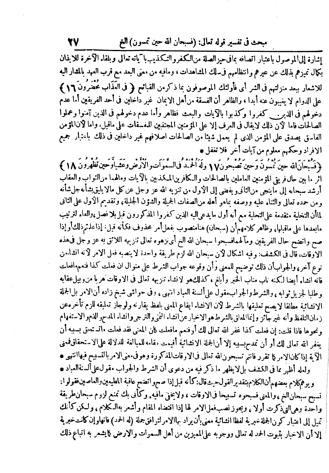 فسبحان الله حين تمسون وحين تصبحون 71 وله الحمد في السموات والأرض وعشيا وحين تظهرون 81 أثر ما بين حال فريقي المؤمنين العاملين بالصالحات والكافرين المكذبين بالآيات وما لهما من الثواب والعقاب أرشد سبحانه إلى ما ينجي من الثاني ويفضي إلى الأول من تنزيه الله عزوجل عن كل ما لا يليق بشأنه جل شأنه ومن حمده تعالى والثناء عليه ووصفه بما هو أهله من الصفات الجميلة والشؤون الجليلة وتقديم الأول على الثاني لما أن التخلية متقدمة على التحلية مع أنه أول ما يدعى إليه الذين كفروا المذكورون قبل بلا فصل والفاء لترتيب ما بعدها على ما قبلها وظاهر كلامهم أن سبحان هنا منصوب بفعل أمر محذوف فكأنه قيل : إذا علمتم ذلك أو إذا صح وأتضح حال الفريقين ومآلهما فسبحوا سبحان الله إلخ أي نزهوه تعالى تنزيهه اللائق به عزوجل في هذه الأوقات قال في الكشف : وفيه إشكال لأن سبحان الله لزم طريقة واحدة لا ينصبه فعل الأمر لأنه إنشاء من نوع آخر والجواب أن ذلك توضيح للمعنى وأن وقوعه جواب الشرط على مونال إن فعلت كذا فنعم ما فعلت فإنه إنشاء ايضا لكنه ناب مناب الخبر وأبلغ كذلك هو لإنشاء تنزيهه تعالى في الأوقات هربا من وبيل عقابه وطلبا لجزيل ثوابه والشرط والجواب مقول على ألسنة العباد إنتهى وفي حواشي شيخ زاده أن الأمر بل الجملة الإنشائية مطلقا لا يصح تعليقها بالشرط لأن الإنشاء إيقاع المعنى بلفظ يقارنه ولو جاز تعليقه للزم تأخره عن زمان التلفظ وأنه غير جائز وإنما المعلق بالشرط هو الإخبار عن إنشاء التمني والترجي وإنشاء المدح والذم والإستفهام ونحوها فإذا قلت : إن فعلت كذا غفر الله تعالى لك أو فنعم ما فعلت كان المعنى فقد فعلت ما تستحق بسببه أن يغفر الله تعالى لك أو أن تمدح بسببه إلا أن الجملة الإنشائية أقيمت مقامه للمبالغة للدلالة على أن الإستحقاق فمعنى الآية إذا كان الأمر كما تقرر فأنتم تسبحون الله تعالى في الأوقات المذكورة وهو في معنى الأمر بالتسبيح فيها إنتهى