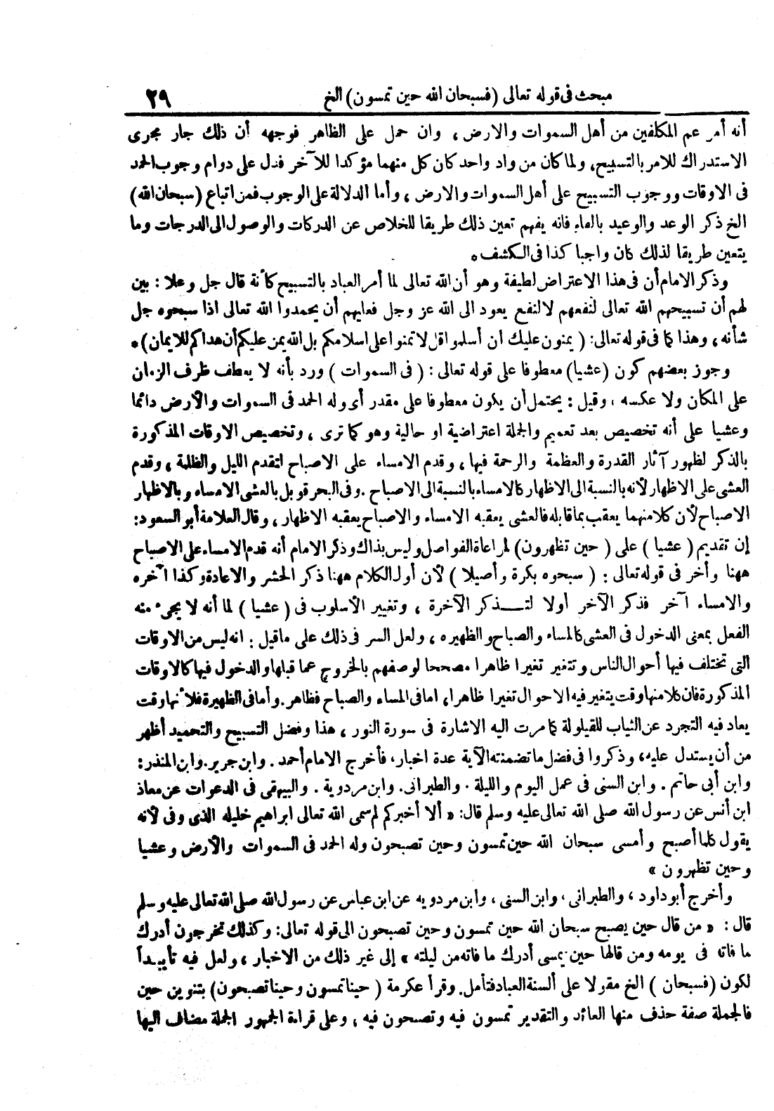 أنه أمر عم المكلفين من أهل السموات والأرض وإن حمل على الظاهر فوجهه أن ذلك جار مجرى الإستدراك للأمر بالتسبيح ولما كان من واد واحد كان كل منهما مؤكدا للآخر فدل على دوام وجوب الحمد في الأوقات ووجوب التسبيح على أهل السموات والأرض وأما الدلالة على الوجوب فمن إتباع سبحان الله إلخ ذكر الوعد والوعيد بالفاء فإنه يفهم تعين ذلك طريقا للخلاص عن الدركات والوصول إلى الدرجات وما يتعين طريقا لذلك كان واجبا كذا في الكشف