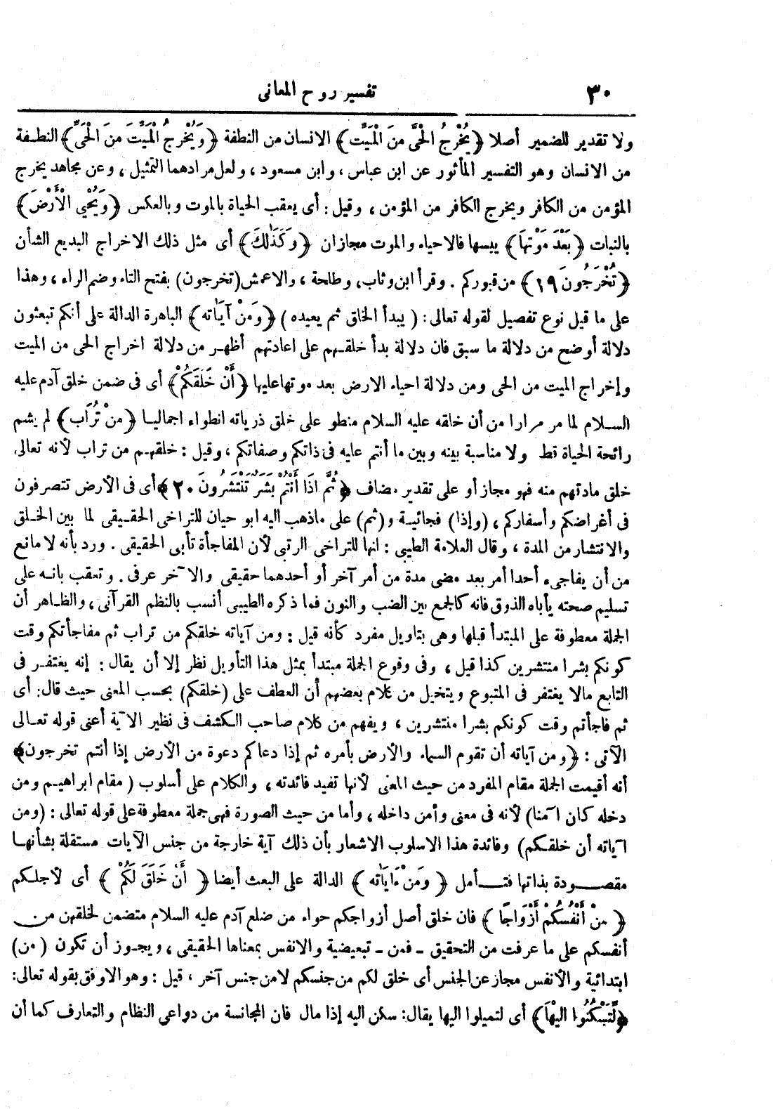 ولا تقدير للضمير أصلا يخرج الحي من الميت الإنسان من النطفة ويخرج الميت من الحي النطفة من الإنسان وهو التفسير المأثور عن إبن عباس وإبن مسعود ولعل مرادهما التمثيل وعن مجاهد يخرج المؤمن من الكافر ويخرج الكافر من المؤمن وقيل : أي يعقب الحياة بالموت وبالعكس ويحيي الأرض بالنبات بعد موتها يبسها فالأحياء والموت مجازان وكذلك أي مثل ذلك الإخراج البديع الشأن تخرجون 91 من قبوركم وقرأ إبن وثاب وطلحة والأعمش تخرجون بفتح التاء وضم الراء وهذا على ما قيل نوع تفصيل لقوله تعالى : يبدأ الخلق ثم يعيده ومن آياته الباهرة الدالة على أنكم تبعثون دلالة أوضح من دلالة ما سبق فإن دلالة بدأ خلقهم على إعادتهم أظهر من دلالة إخراج الحي من الميت وإخراج الميت من الحي ومن دلالة إحياء الأرض بعد موتها عليها أن خلقكم أي في ضمن خلق آدم عليه السلام لما مر مرارا من أن خلقه عليه السلام منطو على خلق ذرياته إنطواء إجماليا من تراب لم يشم رائحة الحياة قط ولا مناسبة بينه وبين ما أنتم عليه في ذاتكم وصفاتكم وقيل : خلقهم من تراب لأنه تعالى خلق مادتهم منه فهو مجاز أو على تقدير مضاف ثم إذا أنتم بشر تنطقون 02 أي في الأرض تتصرفون في أغراضكم وأسفاركم وإذا فجائية و ثم على ما ذهب إليه أبو حيان للتراخي الحقيقي لما بين الخلق والإنتشار من المدة وقال العلامة الطيبيب : إنها للتراخي الرتبي لأن المفاجأة تأبى الحقيقة ورد بأنه لا مانع من أن يفاجيء أحدا أمر بعد مضي مدة من أمر آخر أو أحدهما حقيقي والآخر عرفي وتعقب بأنه على تسليم صحته يأباه الذوق فإنه كالجمع بين الضب والنون فما ذكره الطيبي أنسب بالنظم القرآني والظاهر أن الجملة معطوفة عل ىالمبتدأ قبلها وهي بتأويل مفرد كأنه قيل : ومن آياته خلقكم من تراب ثم مفاجأتكم وقت كونكم بشرا منتشرين كذا قيل وفي وقوع الجملة مبتدأ بمثل هذا التأويل نظر إلا أن يقال : إنه يغتفر في التابع ما لا يغتفر في المتبوع ويتخيل من كلام بعضهم أن العطف على خلقكم بحسب المعنى حيث قال : أي ثم فاجأتم وقت كونكم بشرا منتشرين ويفهم من كلام صاحب الكشف في نظير الآية أعنى قوله تعالى الآتي : ومن آياته أن تقوم السماء والأرض بأمره ثم إذا دعاكم دعوة من الأرض إذا أنتم تخرجون أنه أقيمت الجملة مقام المفرد من حيث المعنى لأنها تفيد فائدته والكلام على أسلوب مقام إبراهيم ومن دخله كان آمنا لأنه في معنى وأمن داخله وأما من حيث الصورة فهي جملة معطوفة على قوله تعالى : ومن آياته أن خلقكم وفائدة هذا الأسلوب الإشعار بأن ذلك آية خارجة من جنس الآيات مستقلة بشأنها مقصودة بذاتها فتأمل ومن آياته الدالة على البعث أيضا أن خلق لكم أي لأجلكم من أنفسكم أزواجا فإن خلق أصل أزواجكم حواء من ضلع آدم عليه السلام متضمن لخلقهن من أنفسكم على ما عرفت من التحقيقفمن تبعيضية والأنفس بمعناها الحقيقي ويجوز أن تكون من إبتدائية والأنفس مجاز عن الجنس أي خلق لكم من جنسكم لا من جنس آخر قيل : وهو الأوفق بقوله تعالى : لتسكنوا إليها أي لتميلوا إليها يقال : سكن إليه إذا مال فإن المجانسة من دواعي النظام والتعارف كما أن