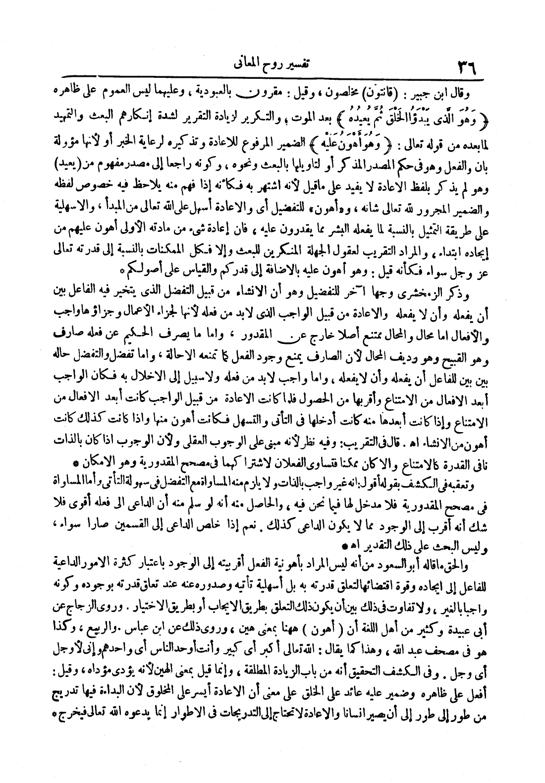 والحق ما قاله أبو السعود من أنه ليس المراد بأهونية الفعل أقربيته إلى الوجود بإعتبار كثرة الأمور الداعية للفاعل إلى إيجاده وقوة إقتضائها لتعلق قدرته به بل أسهلية تأتيه وصدوره عنه عند تعلق قدرته بوجوده وكونه واجبا بالغير ولا تفاوت في ذلك بين أن يكون ذلك التعلق بطريق الإيجاب أو بطريق الإختيار وروى الزجاج عن أبي عبيدة وكثير من أهل اللغة أن أهون ههنا بمعنى هين وروى ذلك عن إبن عباس والربيع وكذا هو في مصحف عبدالله وهذا كما يقال : الله تعالى أكبر أي كبير وأنت أوحد الناس أي واحدهم وإني لأوجل أي وجل وفي الكشف التحقيق أنه من باب الزيادة المطلقة وإنما قيل بمعنى الهين لأنه يؤدي مؤداه وقيل : أفعل على ظاهره وضمير عليه عائد عل ىالخلق على معنى أن الإعادة أيسر على المخلوق لأن البداءة فيها تدريج من طور إلى طور إلى أن يصير إنسانا والإعادة لا تحتاج إلى التدريجات في الأطوار إنما يدعوه الله تعالى فيخرج