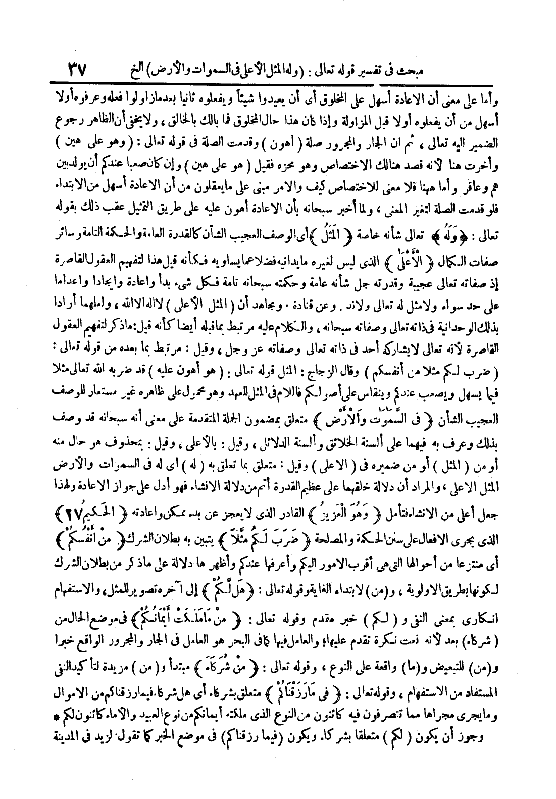 وأما على معنى أن الإعادة أسهل على المخلوق أي أن يعيدوا شيئا ويفعلوه ثانيا بعد ما زاولوا فعله وعرفوه ولا أسهل من أن يفعلوه أولا قبل المزاولة وإذا كان هذا حال المخلوق فما بالك بالخالق ولا يخفى أن الظاهر رجوع الضمير إليه تعالى ثم إن الجار والمجرور صلة أهون وقدمت الصلة في قوله تعالى : وهو علي هين وأخرت هنا لأنه قصد هنالك الإختصاص وهو محزه فقيل هو علي هين وإن كان صعبا عندكم أن يولد بين هم وعاقر وأما ههنا فلا معنى للإختصاص كيف والأمر مبني على ما يعقلون من أن الإعادة أسهل من الإبتداء فلو قدمت الصلة لتغير المعنى ولما أخبر سبحانه بأن الإعادة أهون عليه على طريق التمثيل عقب ذلك بقوله تعالى : وله تعالى شأنه خاصة المثل أي الوصف العجيب الشأن كالقدرة العامة والحكمة التامة وسائر صفات الكمال الأعلى الذي ليس لغيره ما يدانيه فضلا عما يساويه فكأنه قيل هذا لتفهيم العقول القاصرة إذ صفاته تعالى عجيبة وقدرته جل شأنه عامة وحكمته سبحانه تامة فكل شيء بدأ وإعادة وإيجادا وإعداما على حد سواء ولا مثل له تعالى ولاند وعن قتادة ومجاهد أن المثل الأعلى لا إله إلا الله ولعلهما أرادا بذلك الوحدانية في ذاته تعالى وصفاته سبحانه والكلام عليه مرتبط بما قبله أيضا كأنه قيل : ما ذكر لتفهيم العقول القاصرة لأنه تعالى لا يشاركه أحد في ذاته تعالى وصفاته عزوجل وقيل : مرتبط بما بعده من قوله تعالى : ضرب لكم مثلا من أنفسكم وقال الزجاج : المثل قوله تعالى : هو أهون عليه قد ضربه الله تعالى مثلا فيما يسهل ويصعب عندكم وينقاس على أصولكم فاللام في المثل للعهد وهو محمول على ظاهره غير مستعار للوصف العجيب الشأن في السموات والأرض متعلق بمضمون الجملة المتقدمة على معنى أنه سبحانه قد وصف بذلك وعرف به فيهما على ألسنة الخلائق وألسنة الدلائل وقيل : بالأعلى وقيل : بمحذوف هو حال منه أو من المثل أو من ضميره في الأعلى وقيل : متعلق بما تعلق به له أي له في السموات والأرض المثل الأعلى والمراد أن دلالة خلقهما على عظيم القدرة أتم من دلالة الإنشاء فهو أدل على جواز الإعادة ولهذا جعل أعلى من الإنشاء فتأمل وهو العزيز القادر الذي لا يعجز عن بدء ممكن وإعادته الحكيم 72 الذي يجري الأفعال على سنن الحكمة والمصلحة ضرب لكم مثلا يتبين به بطلان الشرك من أنفسكم أي منتزعا من أحوالها التي هي أقرب الأمور إليكم وأعرفها عندكم وأظهرها دلالة على ما ذكر من بطلان الشرك لكونها بطريق الأولوية و من لإبتداء الغاية وقوله تعالى : هل لكم إلى آخره تصوير للمثل والإستفهام إنكاري بمعنى النفي و لكم خبر مقدم وقوله تعالى : من ما ملكت أيمانكم في موضع الحال من شركاء بعد لأنه نعت نكرة تقدم عليها والعامل فيها كما في البحر هو العامل في الجار والمجرور الواقع خبرا و من للتبعيض و ما واقعة على النوع وقوله تعالى : من شركاء مبتدأ و من مزيدة لتأكيد النفي المستفاد من الإستفهام وقوله تعالى : في ما رزقناكم متعلق بشركاء أي هل شركاء فيما رزقناكم من الأموال وما يجري مجراها مما تنصرفون فيه كائنون من النوع الذي ملكته أيمانكم من نوع العبيد والأماء كائنون لكم