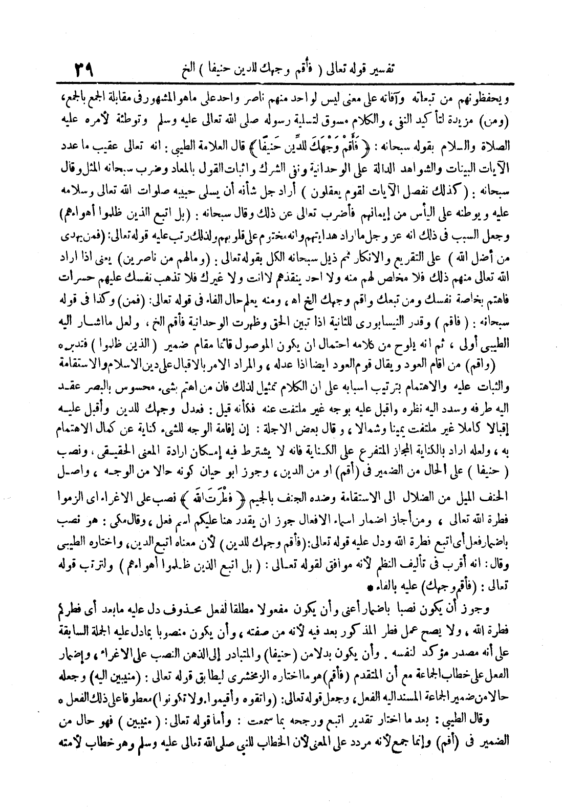 وأقم من أقام العود ويقال قوم العود أيضا إذا عدله والمراد الأمر بالإقبال على دين الإسلام والإستقامة والثبات عليه والإهتمام بترتيب أسبابه على أن الكلام تمثيل لذلك فإن من أهتم بشيء محسوس بالبصر عقد إليه طرفه وسدد إليه نظره وأقبل عليه بوجه غير ملتفت عنه فكأنه قيل : فعدل وجهك للدين واقبل عليه إقبالا كاملا غير ملتفت يمينا وشمالا وقال بعض الأجلة : إن إقامة الوجه للشيء كناية عن كمال الإهتمام به ولعله أراد بالكناية المجاز المتفرع على الكناية فإنه لا يشترط فيه إمكان إرادة المعنى الحقيقي ونصب حنيفا على الحال من الضمير في أقم أو من الدين وجوز أبو حيان كونه حالا من الوجه وأصل الحنف الميل من الضلال إلى الإستقامة وضده الجنف بالجيم فطرت الله نصب على الإغراء أي ألزموا فطرة الله تعالى ومن أجاز إضمار أسماء الأفعال جوز أن يقدر هنا عليكم أسم فعل وقال مكي : هو نصب بإضمار فعل أي أتبع فطرة الله ودل عليه قوله تعالى : فأقم وجهك للدين لأن معناه أتبع الدين وأختاره الطيبي وقال : إنه أقرب في تأليف النظم لأنه موافق لقوله تعالى : بل أتبع الذين ظلموا أهواءهم ولترتب قوله تعالى : فأقم وجهك عليه بالفاء