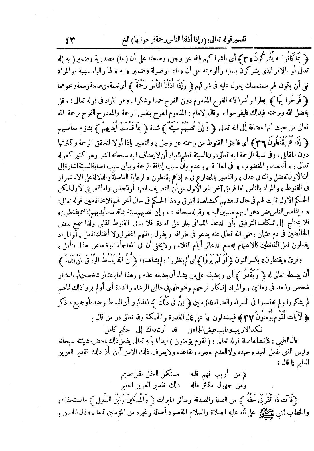 بما كانوا به يشركون 53 أي بإشراكهم بالله عزوجل وصحته على أن ما مصدرية وضمير به له تعالى أو بالأمر الذي يشركون بسببه وألوهيته على أن ما موصولة وضمير به لها والباء سببية والمراد نفي أن يكون لهم مستمسك يعول عليه في شركهم وإذا أذقنا الناس رحمة أي نعمة من صحة وسعة ونحوهما فرحوا بها بطرا وأشرا فإنه الفرح المذموم دون الفرح حمدا وشكرا وهو المراد في قوله تعالى : قل بفضل الله وبرحمته فبذلك فليفرحوا وقال الإمام : المذموم الفرح بنفس الرحمة والممدوح الفرح برحمة الله تعالى من حيث أنها مضافة إلى الله تعالى وإن تصبهم سيئة شدة بما قدمت أيديهم بشؤم معاصيهم إذا هم يقنطون 63 أي فاجؤا القنوط من رحمته عزوجل والتعبير بإذا أولا لتحقق الرحمة وكثرتها دون المقابل وفي نسبة الرحمة إليه تعالى دون السيئة تعليم للعباد أن لا يضاف إليه سبحانه الشر وهو كثير كقوله تعالى : أنعمت والمغضوب في الفاتحة وعدم بيان سبب إذاقة الرحمة وبيان سبب إصابة السيئة إشارة إلى أن الأول تفضل والثاني عدل والتعبير بالمضارع في إذا هم يقنطون لرعاية الفاصلة والدلالة على الإستمرار في القنوط والمراد بالناس أما فريق آخر غير الأول على أن التعريف للعهد أو للجنس وأما الفريق الأول لكن الحكم الأول ثابت لهم في حال تدهشهم كمشاهدة العرق وهذا الحكم في حال آخر لهم فلا مخالفة بين قوله تعالى : وإذا مس الناس ضر دعوا ربهم منيبين إليه وقوله سبحانه : وإن تصبهم سيئة بما قدمت أيديهم إذا هم يقنطون فلا يحتاج إلى تكلف التوفيق بأن الدعاء اللساني جار على العادة فلا ينافي القنوط القلبي ولذا سمع بعض الخائضين في دم عثمان رضي الله تعالى عنه يدعو في طوافه ويقول : اللهم أغفر لي ولا أظنك تفعل أو المراد يفعلون فعل القانطين كالإهتمام بجمع الذخائر أيام الغلاء ولا يخفى أن في المفاجأة نبوة ما عن هذا فتأمل