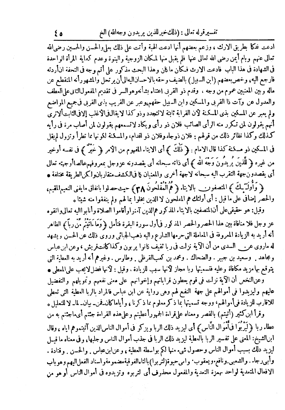 أدعت فدكا بطريق الأرث وزعم بعضهم أنها أدعت الهبة وأتت على ذلك بعلي والحسن والحسين رضي الله تعالى عنهم وبأم أيمن رضي الله تعالى عنها فلم يقبل منها لمكان الزوجية والبنوة وعدم كفاية المرأة الواحدة في الشهادة في هذا الباب فأدعت الأرث فكان ما كان وهذا البحث مذكور على أتم وجه في التحفة أن أردته فأرجع إليه وخص بعضهم إبن السبيل بالضيف وحقه بالإحسان إليه إلى أن يرتحل والمشهور أنه المنقطع عن ماله وبين المعنيين عموم من وجه وقدم ذو القربى إعتناء بشأنه وهو السر في تقديم المفعول الثاني على العطف والعدول عن وآت ذا القربى والمسكين وإبن السبيل حقهم وعبر عن القريب بذي القربى في جميع المواضع ولم يعبر عن المسكين بذي المسكنة لأن القرابة ثابتة لا تتجدد وذو كذا لا يقال في الأغلب إلا في الثابت ألا ترى أنهم يقولون لمن تكرر منه الرأي الصائب فلان ذو رأي ويكاد لا تسمعهم يقولون لمن أصاب مرة في رأيه كذلك وكذا نظائر ذلك من قولهم : فلان ذو جاه وفلان ذو أقدام والمسكنة لكونها مما تطرأ وتزول لم يقل في المسكين ذو مسكنة كذا قال الإمام : ذلك أي الإيتاء المفهوم من الأمر خير في نفسه أو خير من غيره للذين يريدون وجه الله أي ذاته سبحانه أي يقصدونه عزوجل بمعروفهم خالصا أو جهته تعالى أي يقصدون جهة التقرب إليه سبحانه لا جهة أخرى والمعنيان كما في الكشف متقاربان ولكن الطريقة مختلفة
