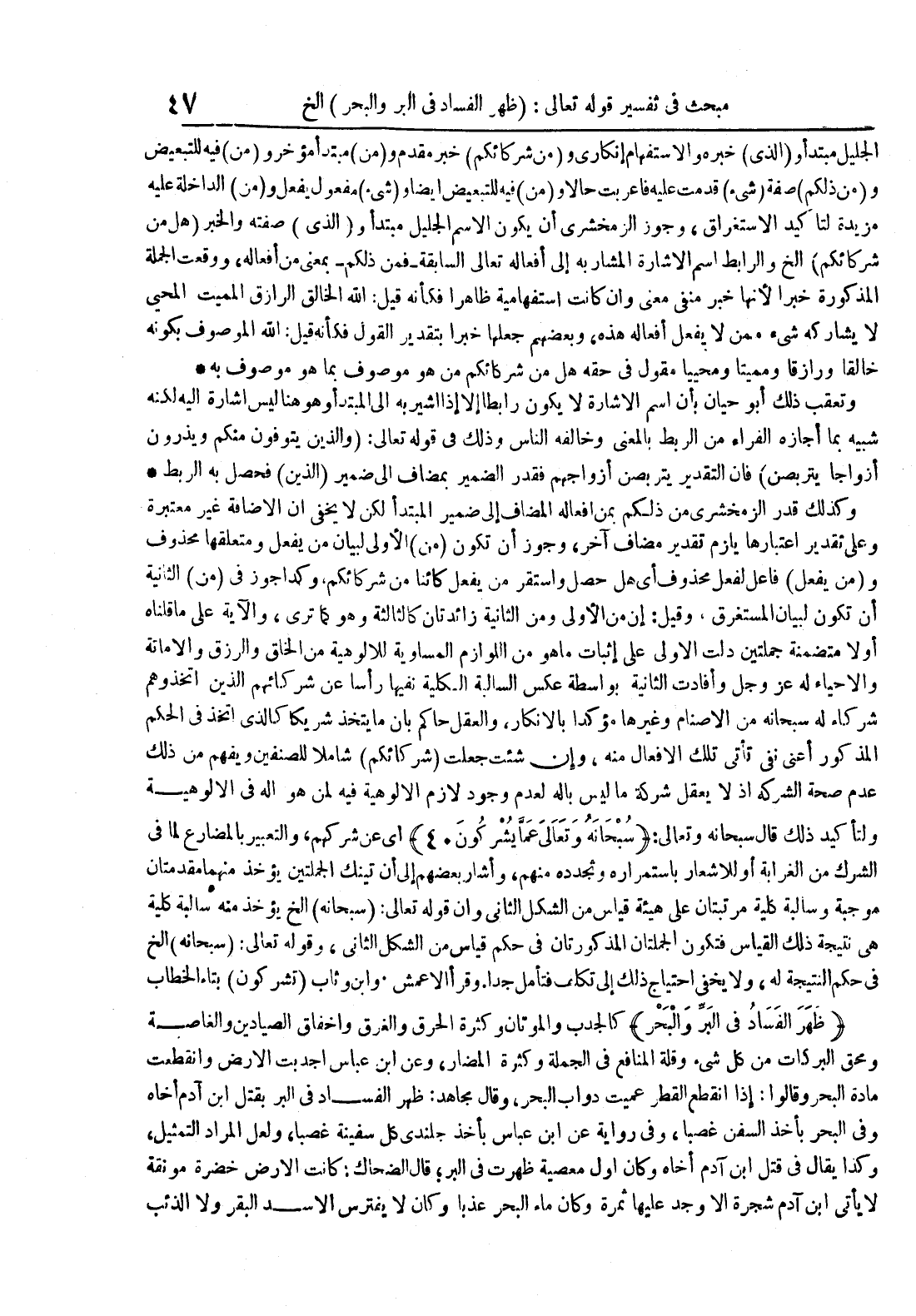 وكذلك قدر الزمخشري من ذلكم بمن أفعاله المضاف إلى ضمير المبتدأ لكن لا يخفى أن الإضافة غير معتبرة وعلى تقدير إعتبارها يلزم تقدير مضاف آخر وجوز أن تكون من الأولى لبيان من يفعل ومتعلقها محذوف و من يفعل فاعل لفعل محذوف أي هل حصل وأستقر من يفعل كائنا من شركائكم وكذا جوز في من الثانية أن تكون لبيان المستغرق وقيل : إن من الأولى ومن الثانية زائدتان كالثالثة وهو كما ترى والآية على ما قلناه أولا متضمنة جملتين دلت الأولى على إثبات ما هو من اللوازم المساوية للألوهية من الخلق والرزق والأماتة والأحياء له عزوجل وأفادت الثانية بواسطة عكس السالبة الكلية نفيها رأسا عن شركائهم الذين أتخذوهم شركاء له سبحانه من الأصنام وغيرها مؤكدا بالإنكار والعقل حاكم بأن ما يتخذ شريكا كالذي أتخذ في الحكم المذكور أعني نفي تأتي تلك الأفعال منه وإن شئت جعلت شركائكم شاملا للصنفين ويفهم من ذلك عدم صحة الشركة إذ لا يعقل شركة ما ليس باله لعدم وجود لازم الألوهية فيه لمن هو إله في الألوهية ولتأكيد ذلك قال سبحانه وتعالى : سبحانه وتعالى عما يشركون 04 أي عن شركهم والتعبير بالمضارع لما في الشرك من الغرابة أو للأشعار بإستمراره وتجدده منهم وأشار بعضهم إلى أن تينك الجملتين يؤخذ منهما مقدمتان موجبة وسالبة كلية مرتبتان على هيئة قياس من الشكل الثاني وإن قوله تعالى : سبحانه إلخ يؤخذ منه سالبة كلية هي نتيجة ذلك القياس فتكون الجملتان المذكورتان في حكم قياس من الشكل الثاني وقوله تعالى : سبحانه إلخ في حكم النتيجة له ولا يخفى إحتياج ذلك إلى تكلف فتأمل جدا وقرأ الأعمش وإبن وثاب تشركون بتاء الخطاب ظهر الفساد في البر والبحر كالجدب والموتان وكثرة الحرق والغرق وإخفاق الصيادين والغاصة ومحق البركات من كل شيئ وقلة المنافع في الجملة وكثرة المضار وعن إبن عباس أجدبت الأرض وأنقطعت مادة البحر وقالوا : إذا أنقطع القطر عميت دواب البحر وقال مجاهد : ظهر الفساد في البر بقتل إبن آدم أخاه وفي البحر باخذ السفن غصبا وفي رواية عن إبن عباس بأخذ جلندي كل سفينة غصبا ولعل المراد التمثيل وكذا يقال في قتل إبن آدم أخاه وكان أول معصية ظهرت في البر قال الضحاك : كانت الأرض خضرة مونقة لا يأتي إبن آدم شجرة إلا وجد عليها ثمرة وكان ماء البحر عذبا وكان لا يفترس الأسد البقر ولا الذئب