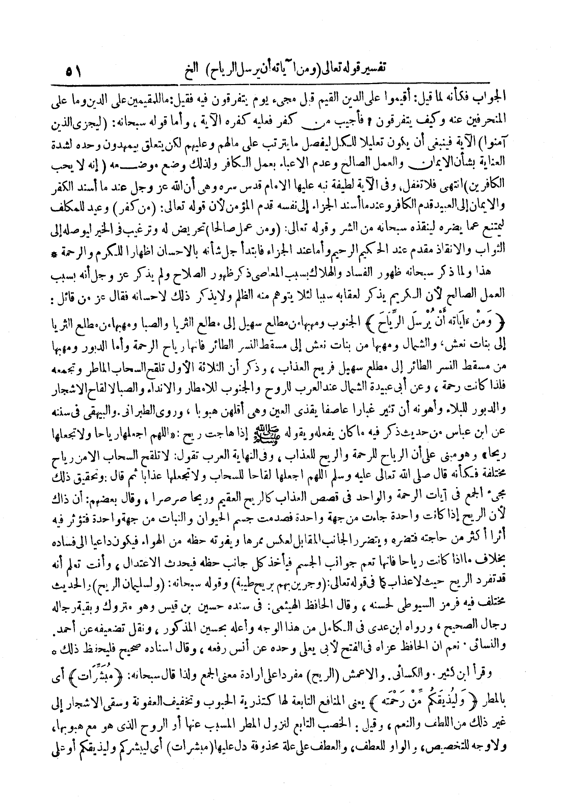 هذا ولما ذكر سبحانه ظهور الفساد والهلاك بسبب المعاصي ذكر ظهور الصلاح ولم يذكر عزوجل أنه بسبب العمل الصالح لأن الكريم يذكر لعقابه سببا لئلا يتوهم منه الظلم ولا يذكر ذلك لإحسانه فقال عز من قائل : ومن آياته أن يرسل الرياح الجنوب ومهبها من مطلع سهيل إلى مطلع الثريا والصبا ومهبها من مطلع الثريا إلى بنات نعش والشمال ومهبها من بنات نعش إلى مسقط النسر الطائر فإنها رياح الرحمة وأما الدبور ومهبها من مسقط النسر الطائر إلى مطلع سهيل فريح العذاب وذكر أن الثلاثة الأول تلقح السحاب الماطر وتجمعه فلذا كانت رحمة وعن أبي عبيدة الشمال عند العرب للروح والجنوب للأمطار والأنداء والصبا لإلقاح الأشجار والدبور للبلاء وأهونه أن تثير غبارا عاصفا يقذى العين وهي أقلهن هبوبا وروى الطبراني والبيهقي في سننه عن إبن عباس من حديث ذكر فيه ما كان يفعله ويقوله إذا هاجت ريح : اللهم أجعلها رياحا ولا تجعلها ريحا وهو مبني على أن الرياح للرحمة والريح للعذاب وفي النهاية العرب تقول : لا تلقح السحاب إلا من رياح مختلفة فكأنه قال صلى الله تعالى عليه وسلم اللهم أجعلها لقاحا للسحاب ولا تجعلها عذابا ثم قال : وتحقيق ذلك مجيء الجمع في آيات الرحمة والواحد شديرغننب كالريح العقيم وريحا صرصرا وقال بعضهم : أن ذاك لأن الريح إذا كانت واحدة جاءت من جهة واحدة فصدمت جسم الحيوان والنبات من جهة واحدة فتؤثر فيه أثرا أكثر من حاجته فتضره ويتضرر الجانب المقابل لعكس ممرها ويفوته حظه من الهواء فيكون داعيا إلى فساده بخلاف ما إذا كانت رياحا فإنها تعم جوانب الجسم فيأخذ كل جانب حظه فيحدث الإعتدال وأنت تعلم أنه قد تفرد الريح حيث لا عذاب كما في قوله تعالى : وجرين بهم بريح طيبة وقوله سبحانه : ولسليمان الريح والحديث مختلف فيه فرمز السيوطي لحسنه وقال الحافظ الهيثمي : في سنده حسين بن قيس وهو متروك وبقية رجاله رجال الصحيح ورواه إبن عدي في الكامل من هذا الوجه وأعله بحسين المذكور ونقل تضعيفه عن أحمد والنسائي نعم أن الحافظ عزاه في الفتح لأبي يعلى وحده عن أنس رفعه وقال إسناده صحيح فليحفظ ذلك
