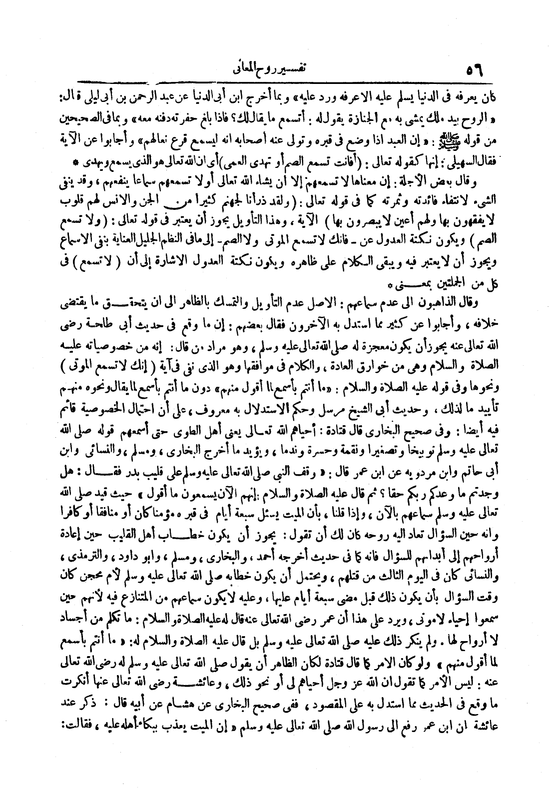 كان يعرفه في الدنيا يسلم عليه إلا عرفه ورد عليه وبما أخرج إبن أبي الدنيا عن عبدالرحمن بن أبي ليلى قال : الروح بيد ملك يمشي به مع الجنازة يقول له : أتسمع ما يقال لك فإذا بلغ حفرته دفنه معه وبما في الصحيحين من قوله : إن العبد إذا وضع في قبره وتولى عنه أصحابه إنه ليسمع قرع نعالهم وأجابوا عن الآية فقال السهيلي : إنها كقوله تعالى : أفأنت تسمع الصم أو تهدي العمى أي إن الله تعالى هو الذي يسمع ويهدي