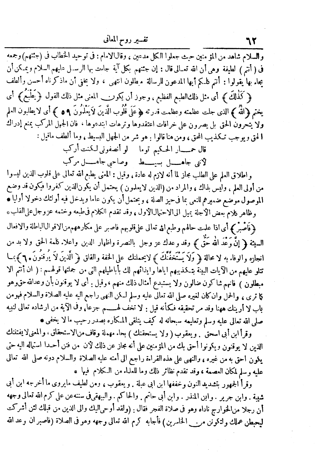 والسلام شاهد من المؤمنين حيث جعلوا الكل مدعين وقال الإمام : في توحيد الخطاب في جئتهم وجمعه في أنتم لطيفة وهي أن الله تعالى قال : إن جئتهم بكل آية جاءت بها الرسل عليهم السلام ويمكن أن يجاء بها يقولوا : أنتم كلكم أيها المدعون للرسالة مبطلون إنتهى ولا يخفى أن ما ذكرناه أحسن والطف كذلك أي مثل ذلك الطبع الفظيع وجوز أن يكون المعنى مثل ذلك القول يطبع أي يختم الله الذي جلت عظمته وعظمت قدرته على قلوب الذين لا يعلمون 95 أي لا يطلبون العلم ولا يتحرون الحق بل يصرون على خرافات إعتقدوها وترهات إبتدعوها فإن الجهل المركب يمنع إدراك الحق ويوجب تكذيب المحق ومن هنا قالوا : هو شر من الجهل البسيط وما ألطف ما قيل : قال حمار الحكيم توما لو أنصفوني لكنت أركب لأنني جاهل بسيط وصاحبي جاهل مركب وإطلاق العلم على الطلب مجاز لما أنه لازم له عادة وقيل : المعنى يطبع الله تعالى على قلوب الذين ليسوا من أولى العلم وليس بذاك والمراد من الذين لا يعلمون يحتمل أن يكون الذين كفروا فيكون قد وضع الموصول موضع ضميرهم للنعي بما في حيز الصلة ويحتمل أن يكون عاما ويدخل فيه أولئك دخولا أوليا