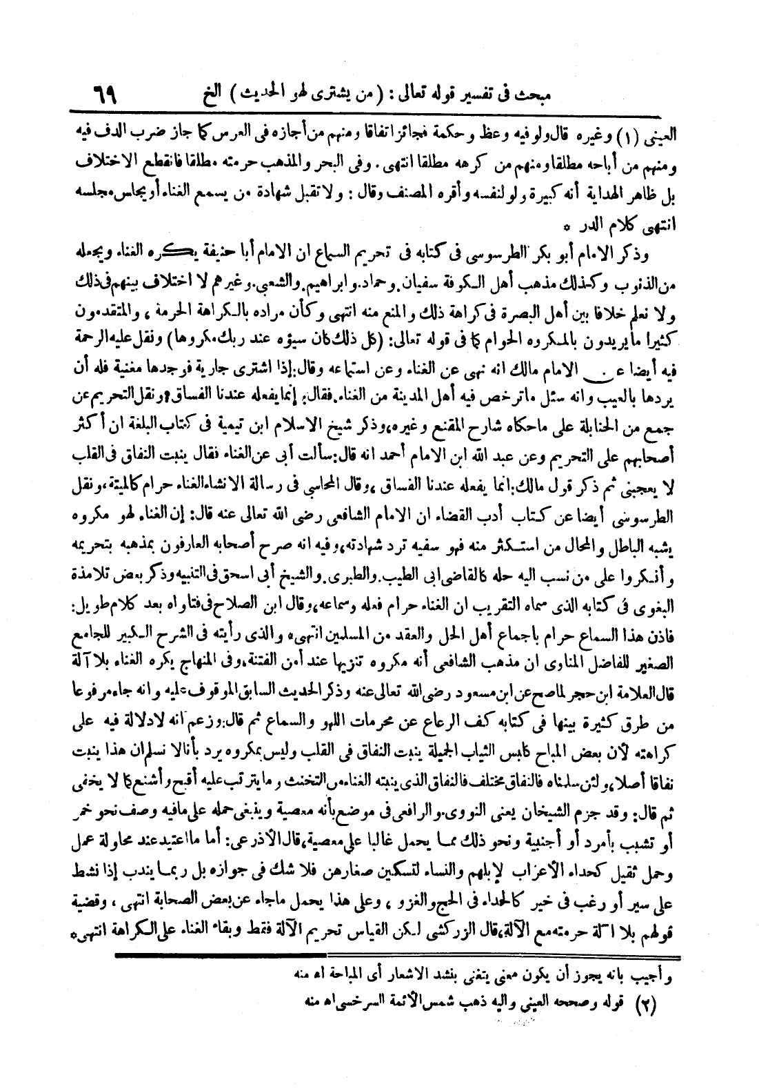 وذكر الأمام أبو بكر الطرسوسي في كتابه في تحريم السماع أن الإمام أبا حنيفة يكره الغناء ويجعله من الذنوب وكذلك مذهب أهل الكوفة سفيان وحماد وإبراهيم والشعبي وغيرهم لا إختلاف بينهم في ذلك ولا نعلم خلافا بين أهل البصرة في كراهة ذلك والمنع منه إنتهى وكأن مراده بالكراهة الحرمة والمتقدمون كثيرا ما يريدون بالمكروه الحرام كما في قوله تعالى : كل ذلك كان سيؤه عند ربك مكروها ونقل عليه الرحمة فيه أيضا عن الإمام مالك إنه نهى عن الغناء وعن إستماعه وقال : إذا أشترى جارية فوجدها مغنية فله أن يردها بالعيب وأنه سئل ما ترخص فيه أهل المدينة من الغناء فقال : إنما يفعله عندنا الفساق ونقل التحريم عن جمع من الحنابلة على ما حكاه شارح المقنع وغيره وذكر شيخ الإسلام إبن تيمية في كتاب البلغة أن أكثر أصحابهم على التحريم وعن عبدالله إبن الإمام أحمد أنه قال : سألت أبي عن الغناء فقال ينبت النفاق في القلب لا يعجبني ثم ذكر قول مالك : إنما يفعله عندنا الفساق وقال المحاسبي في رسالة الإنشاء الغناء حرام كالميتة ونقل الطرسوسي أيضا عن كتاب أدب القضاء أن الإمام الشافعي رضي الله تعالى عنه قال : إن الغناء لهو مكروه يشبه الباطل والمحال من أستكثر منه فهو سفيه ترد شهادته وفيه أنه صرح أصحابه العارفون بمذهبه بتحريمه وأنكروا على من نسب إليه حله كالقاضي أبي الطيب والطبري والشيخ أبي إسحاق في التنبيه وذكر بعض تلامذة البغوي في كتابه الذي سماه التقريب أن الغناء حرام فعله وسماعه وقال إبن الصلاح في فتاواه بعد كلام طويل : فإذن هذا السماع حرام بإجماع أهل الحل والعقد من المسلمين إنتهى
