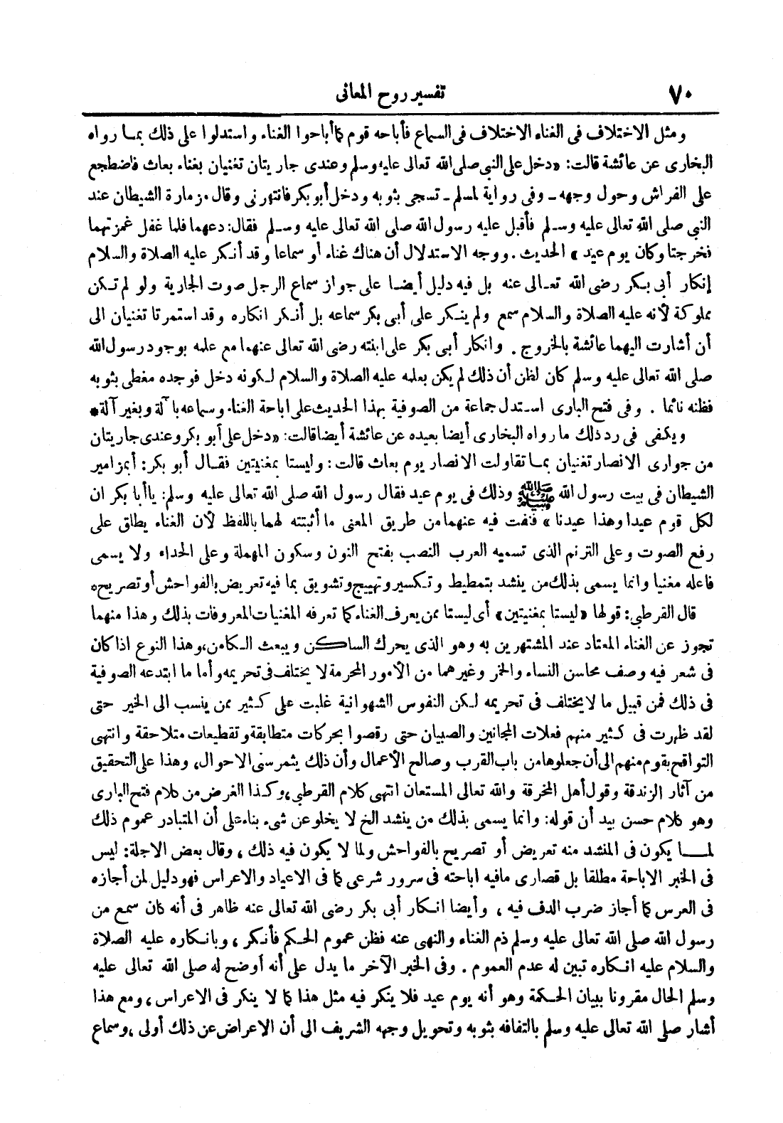 ومثل الإختلاف في الغناء الإختلاف في السماع فأباحه قوم كما أباحوا الغناء وأستدلوا على ذلك بما رواه البخاري عن عائشة قالت : دخل على النبي صلى الله تعالى عليه وسلم وعندي جاريتان تغنيان بغناء بعاث فأضطجع على الفراش وحول وجهه وفي رواية لمسلمتسجى بثوبه ودخل أبو بكر فأنتهرني وقال مزمارة الشيطان عند النبي صلى الله تعالى عليه وسلم فأقبل عليه رسول الله صلى الله تعالى عليه وسلم فقال : دعهما فلما غفل غمرتهما فخرجتا وكان يوم عيد الحديث ووجه الإستدلال أن هناك غناء أو سماعا وقد أنكر عليه الصلاة و السلام إنكار أبي بكر رضي الله تعالى عنه بل فيه دليل أيضا على جواز سماع الرجل صوت الجارية ولو لم تكن مملوكة لأنه عليه الصلاة و السلام سمع ولم ينكر على أبي بكر سماعه بل أنكر إنكاره وقد أستمرتا تغنيان إلى أن أشارت إليهما عائشة بالخروج وإنكار أبي بكر على إبنته رضي الله تعالى عنهما مع علمه بوجود رسول الله صلى الله تعالى عليه وسلم كان لظن أن ذلك لم يكن بعلمه عليه الصلاة و السلام لكونه دخل فوجده مغطى بثوبه فظنه نائما وفي فتح الباري أستدل جماعة من الصوفية بهذا الحديث على إباحة الغناء وسماعه بآلة وبغير آلة