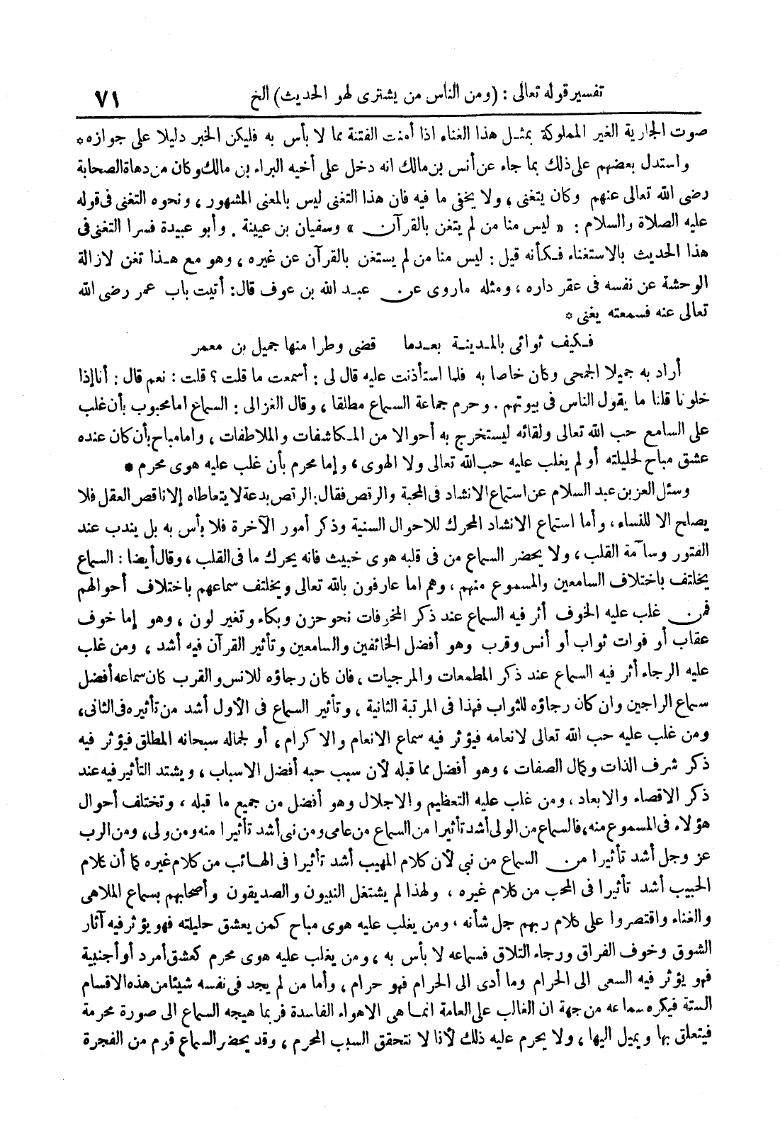 فكيف ثوائي بالمدينة بعدما قضى وطرا منها جميل بن معمر أراد به جميلا الجمحي وكان خاصا به فلما أستأذنت عليه قال لي : أسمعت ما قلت قلت : نعم قال : أنا إذا خلونا ما يقول الناس في بيوتهم وحرم جماعة السماع مطلقا وقال الغزالي : السماع أما محبوب بأن غلب على السامع حب الله تعالى ولقائه ليستخرج به أحوالا من المكاشفات والملاطفات وإما مباح بأن كان عنده عشق مباح لحليته أو لم يغلب عليه حب الله تعالى ولا الهوى وإما محرم بأن غلب عليه هوى محرم