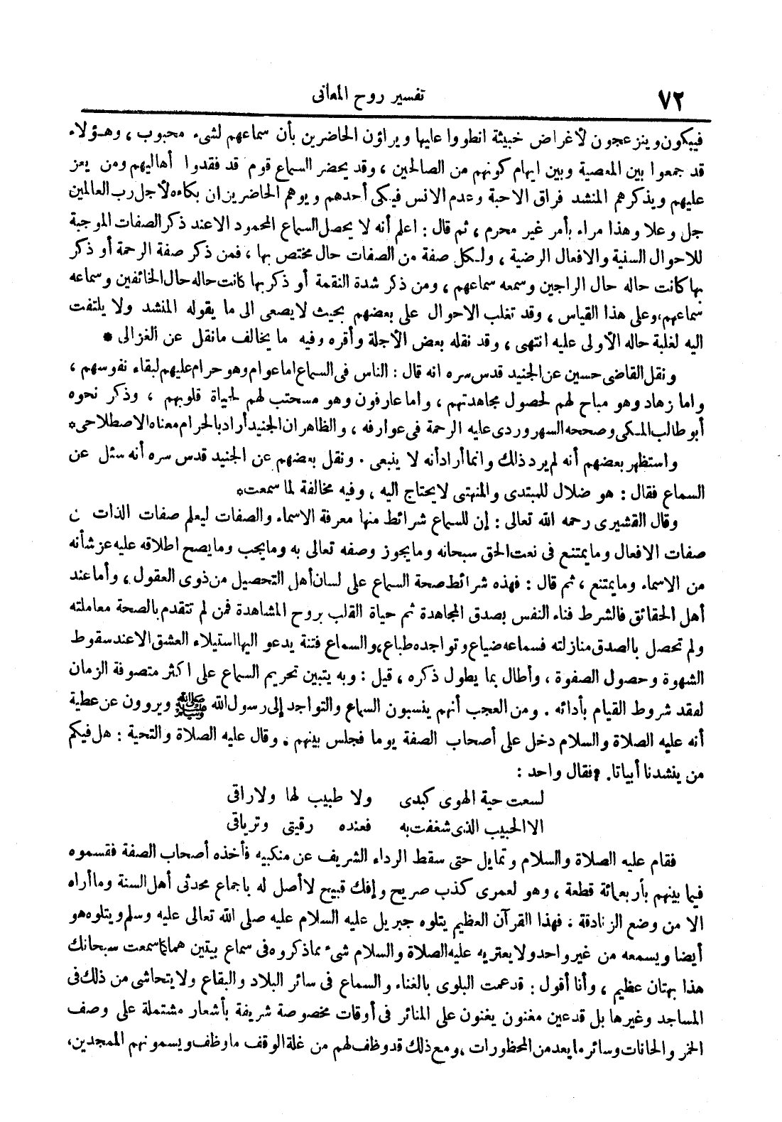 ونقل القاضي حسين عن الجنيد قدس سره أنه قال : الناس في السماع أما عوام وهو حرام عليهم لبقاء نفوسهم وأما زهاد وهو مباح لهم لحصول مجاهدتهم وإما عارفون وهو مسحتب لهم لحياة قلوبهم وذكر نحوه أبو طالب المكي وصححه السهروردي عليه الرحمة في عوارفه والظاهر أن الجنيد أراد بالحرام معناه الإصطلاحي