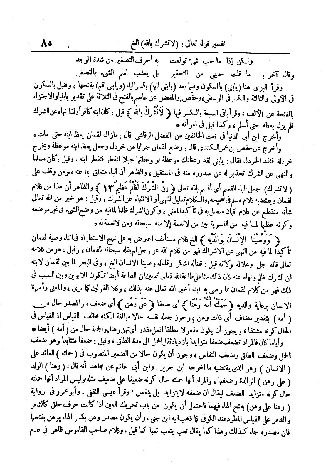 وأخرج عن حفص بن عمر الكندي قال : وضع لقمان جرابا من خردل وجعل يعظ إبنه موعظة ويخرج خردلة فنفد الخردل فقال : يابني لقد وعظتك موعظة لو وعظتها جبلا لتفطر فتفطر إبنه وقيل : كان مسلما والنهي عن الشرك تحذير له عن صدوره منه في المستقبل والظاهر أن الباء متعلق بما عنده ومن وقف على لا تشرك جعل الباء للقسم أي أقسم بالله تعالى إن الشرك لظلم عظيم 31 والظاهر أن هذا من كلام لقمان ويقتضيه كلام مسلم في صحيحه والكلام تعليل للنهي أو الإنتهاء عن الشرك وقيل : هو خير من الله تعالى شأنه منقطع عن كلام لقمان متصل به في تأكيد المعنى وكون الشرك ظلما لما فيه من وضع الشيء في غير موضعه وكونه عظيما لما فيه من التسوية بين من لا نعمة إلا منه سبحانه ومن لا نعمة له