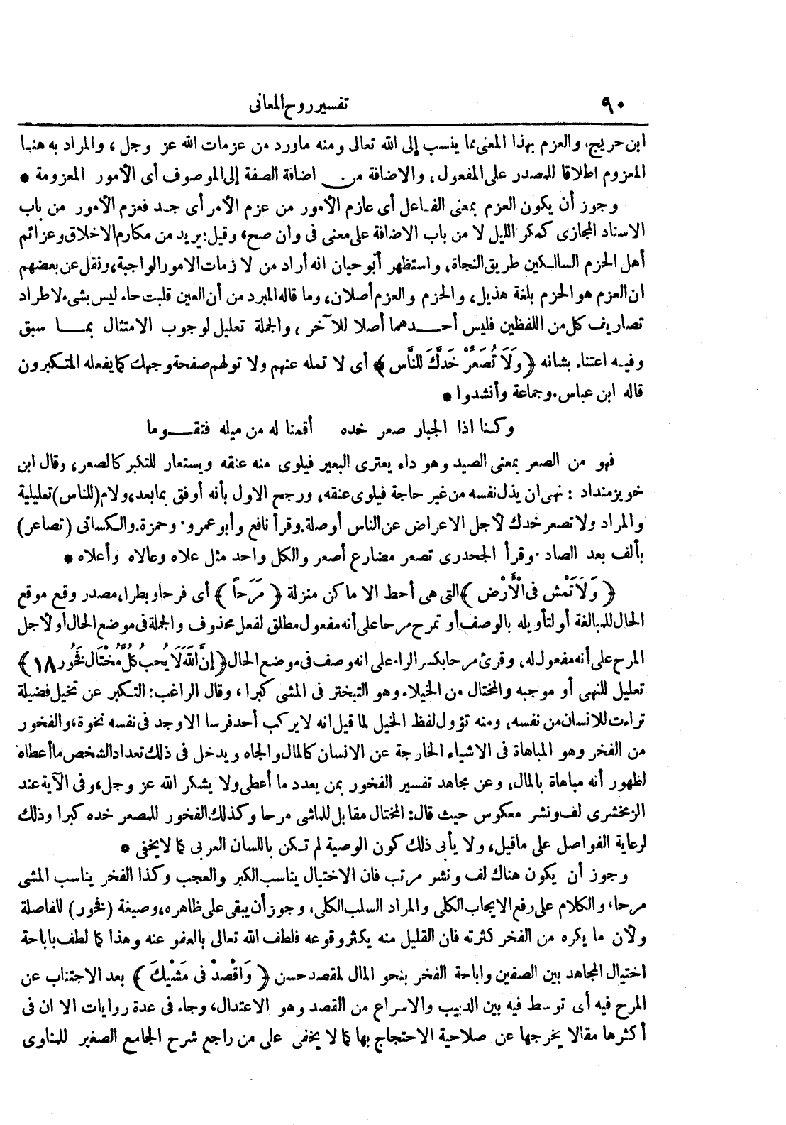 وجوز أن يكون العزم بمعنى الفاعل أي عازم الأمور من عزم الأمر أي جد فعزم الأمور من باب الإسناد المجازي كمكر الليل لا من باب الإضافة على معنى في وإن صح وقيل : يريد من مكارم الأخلاق وعزائم أهل الحزم السالكين طريق النجاة وأستظهر أبو حيان أنه أراد من لازمات الأمور الواجبة ونقل عن بعضهم أن العزم هو الحزم بلغة هذيل والحزم والعزم أصلان وما قاله المبرد من أن العين قلبت جاء ليس بشيء لإطراد تصاريف كل من اللفظين فليس أحدهما أصلا للآخر والجملة تعليل لوجوب الإمتثال بما سبق وفيه إعتناء بشأنه ولا تصعر خدك للناس أي لا تمله عنهم ولا تولهم صفحة وجهك كما يفعله المتكبرون قاله إبن عباس وجماعة وأنشدوا