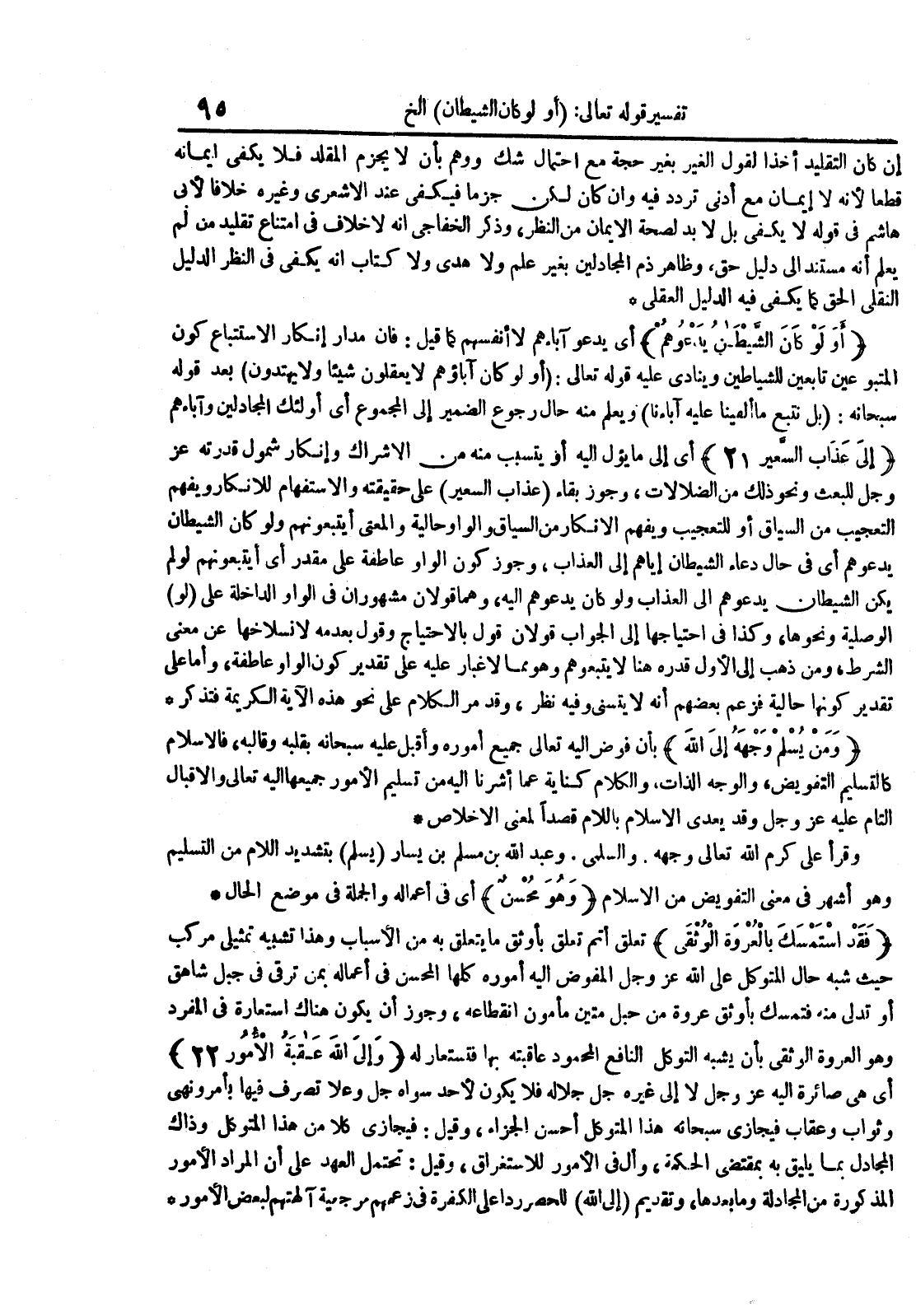 فقد أستمسك بالعروة الوثقى تعلق أتم تعلق بأوثق ما يتعلق به من الأسباب وهذا تشبيه تمثيلي مركب حيث شبه حال المتوكل على الله عزوجل المفوض إليه أموره كلها الحسن في أعماله بمن ترقى في جبل شاهق أو تدلي منه فتمسك بأوثق عروة من حبل متين مأمون إنقطاعه وجوز أن يكون هناك إستعارة في المفرد وهو العروة الوثقى بأن يشبه التوكل النافع المحمود عاقبته بها فتستعار له وإلى الله عاقبة الأمور 22 أي هي صائرة إليه عزوجل لا إلى غيره جل جلاله فلا يكون لأحد سواه جل وعلا تصرف فيها بأمر ونهي وثواب وعقاب فيجازي سبحانه هذا المتوكل أحسن الجزاء وقيل : فيجازي كلا من هذا المتوكل وذاك المجادل بما يليق به بمقتضى الحكمة وأل في الأمور للإستغراق و قيل : تحتمل العهد على أن المراد الأمور المذكورة من المجادلة وما بعدها وتقديم إلى الله للحصر ردا على الكفرة في زعمهم مرجعية آلهتهم لبعض الأمور