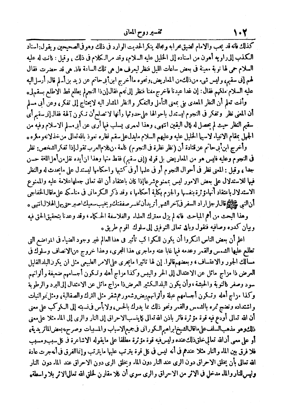 اعلم أن بعض الناس أنكروا أن يكون للكواكب تأثيرا في هذا العالم غير وجود الضياء في المواضع التي تطلع عليها الشمس والقمر وعدمه فيما غابا عنه وما جرى هذا المجرى وهذا خروج عن الإنصاف وسلوك في مسالك الجور والإعتساف وبعضهم قالوا إن لها تأثيرا ما يجري على الأمر الطبيعي مثل أن يكون البد القليل العرض ذا مزاج مائل عن الإعتدال إلى الحر واليبس وكذا مزاج أهله وتكون أجسامهم ضعيفة وألوانهم سود وصفر كالنوبة والحبشة وأن يكون البلد الكثير العرض ذا مزاج مائل عن الإعتدال إلى البرد والرطوبة وكذا مزاج أهله وتكون أجسامهم عبلة وألوانهم بيض وشعورهم شقر مثل الترك والصقالية ومثل نمو النبات واشتداده ونضج ثمره بالشمس والقمر ونحو ذلك مما يدرك بالحس ولا بأس في نسبته إلى الكوكب على معنى أن الله تعالى أودع فيه قوة مؤثرة فأثر بغذن الله تعالى كما ينسب الإحرق إلى النار والري إلى الماء مثلا على معنى ذلك وهو مذهب السلف على ما قال الشيخ إبراهيم الكوراني في جميع الأسباب والمسببات وصرح به بعض الماتريدية أو على معنى أن الله تعالى خلق ذلك عنده وليس فيه مؤثرة مطلقا على ما يقوله الأشاعرة في كل سبب ومسبب فلا فرق بين الماء والنار مثلا عندهم في أنه ليس في كل قوة يترتب عليها ما يترتب وإنما الفرق في أنه جرت عادة الله تعالى بأن يخلق الإحراق دون الري عند النار دون الماء ويخلق الري دون الإحراق عند الماء دون النار وليس للنار والماء مدخل في الأثر من الإحراق والري سوى أن كلا مقارن لخلق الله تعالى الأثر بلا واسطة