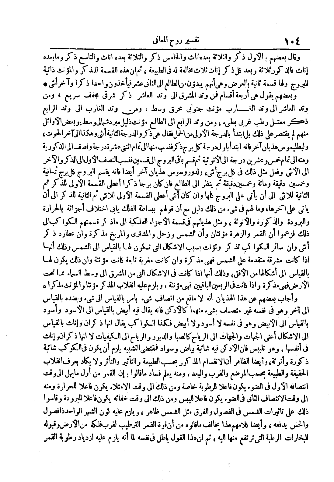 وبعضهم يقول هي أربعة أقسام فمن وتد المشرق إلى وتد العاشر وذكر شرقي مجفف سريع ومن وتد العاشر إلى وتد الغارب مؤنث جنوبي محرق وسط ومن وتد لالغارب إلى وتد الرابع ذكر معتل رطب غربي بطيء ومن وتد الرابع إلى الطالع مؤنث ذليل مبرد شمالي وسط وبعض الأوائل منهم لم يقتصر على ذلك بل ابتدأ بالدرجة الأولى من الحمل فقال هي ذكر والدرجة الثانية أثني وهكذا إلى آخر الحوت ولبطليموس هذيان آخر ابتدأ بأول درجة كل برج ذكر فنسب منها إلى تمام اثنتي عشر درجة ونصف إلى الذكورية ومنه إلى تمام خمس وعشرين درجة إلى الأنوثية ثم قسم باقي الروج إلى قسمين فنسب النصف الأول إلى الذكر والآخر إلى الأنثى وفعل مثل ذلك في كل برج أثني ولدوروسوس هذيان آخر أيضا فإنه يقسم البروج كل برج ثمانية وخمسين دقيقة ومائة وخمسين دقيقة ثم ينظر إلى الطالع فإن كان برجا ذكرا أعطي القسمة الأولى للذكر ثم الثانية للأنثى إلى أن يأتي على الروج كلها وإن كان أثني أعطى القسمة الأولى للأنثى ثم الثانية للذكر إلى أن يأتي آخرها وما لهم في شيء من ذلك دليل مع أن قولهم ببساطة الفلك يأبى اختلاف أجزائه بالخرارة والرودة والذكورة والأنوثة ومثل هذيانهم في قسمة الأجزاء الفلكية إلى ما ذكر قسمتهم الكواكب إلى ذلك فزعموا أن القمر والزهرة مؤنثتان وأن الشمس وزحل والمشتري والمريخ مذكرة وأن عطارد ذكر أنثى وإن سائر الكواكب تذكر وتؤنث بسبب الأشكال التي تكون لها بالقياس إلى الشمس أنها إذا كانت مشرقة متقدمة على الشمس فهي مذكرة وإن كانت مغربة تابعة كانت مؤنثة وإن ذلك يكون لها بالقياس إلى أشكالها من الأفق وذلك أنها إذا كانت في الأشكال التي من المشرق إلى وسط السماء مما تحت الأرض فهي مذكرة وإذا كانت في الربعين الباقيين فهي مؤنثة ويلزم انقلاب المذكر مؤنثا والمؤنث مذكرا