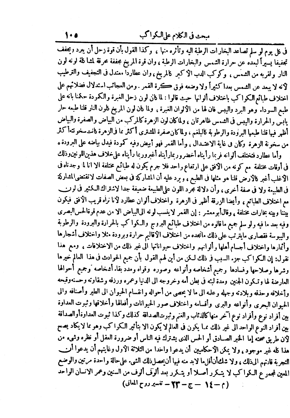 في كل يوم لو سلم تصاعد البخارات الرطبة إليه وتأثره منها وكذا القول بأن قوة زحل أن يبرد ويجفف تجفيفا يسيرا لبعده عن حرارة الشمس والبخارات الرطبة وإن قوة المريخ مجففة مرحقة لمشاكلو لونه لون النار ولقربه من الشمس وكوكب الدب الأكبر كالمريخ وإن عطاردا معتدل في التجفيف والترطيب لأنه لا يبعد عن الشمس بعدا كثيرا ولا وضعه فوق كرة القمر ومن العجائب استدلال فضلا على اختلاف الكواكب باختلاف ألوانها حيث قالوا : لما كان لون زحل الغبرة والكمودة حكمنا بأنه على طبع السوداء وهو البرد واليبس فإن لها من الألوان الغبرة ولما كان لون المريخ كلون النار قلنا طبعه حار يابس والحرارة واليبس في الشمس ظاهرتان ولما كان لون الزهرة كالمركب من البياض والصفرة والبياض أظهر فيها طبعها البرودة والرطوبة كالبلغم ولما كان صفرة المشتري أكثر مما في الزهرة كانت سخونته أكثر من سخونة الزهرة وكان في غاية الأعتدال وأما القمر فهو أبيض وفيه كمودة فيدل بياضه على الرودة