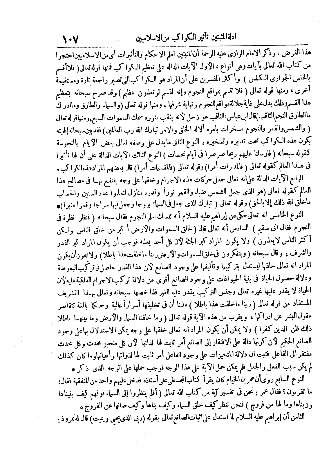 هذا الغرض وذكر الإمام الرازي عليه الرحمة أن المثبتين لعلم الأحكام والتأثيرات أي من الإسلاميين احتجوا من كتاب الله تعالى بآيات وهي أنواع الأول الآيات الدالة على تعظيم الكواكب فمنها قوله تعالى فلا أقسم بالخنس الجواري الكنس وأكثر المفسرين على أن المراد هو الكواكب التي تصير راجعة تارة ومستقيمة أخرى ومنها قوله تعالى فلا أقسم بمواقع النجوم وإنه لقسم لو تعلمون عظيم وقد صرح سبحانه بتعظيم هذا القسم وذلك يدل على غاية جلالة مواقع النجوم ونهاية شرقها ومنها قوله تعالى والسماء والطارق وما أدراك ما الطارق النجم الثاقب قال ابن عباس : الثاقب هو زحل لأنه يثقب بنوره سمك السماوات السبع ومنها قوله تعالى والشمس والقمر والنجوم مسخرات بأمره ألا له الخلق والأمر تبارك الله رب العالمين فقد بين سبحانه إلهيته بكون هذه الكواكب تحت تدبيره وتسخيره النوع الثاني ما يدل على وصفه تعالى بعض الأيام بالنحوسة كقوله سبحانه فأرسلنا عليهم ريحا صرصرا في أيام نحسات النوع الثالث الآيات الدالة على أن لها تأثيرا في هذا العالم كقوله تعالى فالمدبرات أمرا وقوله تعالى فالمقسمات أمرا قال بعضهم المراد هذه الكواكب