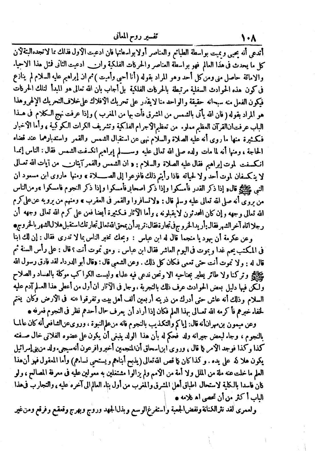 أتدعي أنه يحيي ويميت بواسطة الطبائع والعناصر أولا بواسطتها فإن ادعيت الأول فذلك مما لا تجده البتة لأن كل ما يحدث في هذا العالم فهو بواسطة العناصر والحركات الفلكية وإن ادعيت الثاني فمثل هذا الإحياء والإماتة حاصل مني ومن كل أحد وهو المراد بقوله أنا أحيي وأميت ثم إن إبراهيم عليه السلام لم ينازع في كون هذه الحوادث الفلية مرتبطة بالحركات الفلكية بل أجاب بأن الله تعالى هو المبدأ لتلك الحركات فيكون الفعل منه سبحانه حقيقة والواحد منا لا يقدر على تحريك الأفلاك على خلاف التحريك الإلهي وهذا هو المراد بقوله فإن الله يأتي بالشمس من المشرق فأت بها من المغرب وإذا عرفت نهج الكلام في هذا الباب عرفت أن القرآن العظيم مملوء من تعظيم الأجرام الفلكية وتشريف الكرات الكوكبية وأما الأخبار فكثيرة منها ما روي أنه عليه الصلاة و السلام نهى عن استقبال الشمس والقمر واستدبارهما عند قضاء الحاجة ومنها أنه لما مات ولده صلى الله تعالى عليه وسلم إبراهيم انكسفت الشمس فقال : الناس إنما انكسفت لموت إبراهيم فقال عليه الصلاة و السلام : إن الشمس والقمر آيتان من آيات الله تعالى لا ينكسفان لموت أحد ولا لحياته فإذا رأيتم ذلك فافزعوا إلى الصلاة ومنها ما روي ابن مسعود أن النبي صلى الله عليه و سلم قال إذا ذكر القدر فأمسكوا وغذا ذكر أصحابي فأمسكوا وإذا ذكر النجوم فأمسكوا ومن الناس من يروي أنه صلى الله تعالى عليه وسلم قال : لا تسافروا والقمر في العقرب ومنهم من يرويه عن علي كرم الله تعالى وجهه وإن كان المحدثون لا يقبلونه وأما الآثار فكثيرة أيضا فعن علي كرم الله تعالى وجهه أن رجلا أتاه آخر الشهر فقال : أريد الخروج في تجارة فقال : تريد أن يمحق الله تعالى تجارتك استقبل هلال الشهر بالخروج