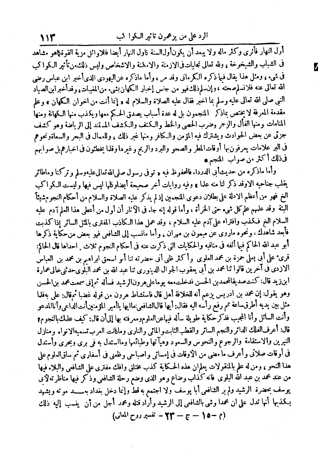 وأما ما ذكره من حديث أبي الدرداء فالمحفوظ فيه توفي رسول الله صلى الله تعالى عليه وسلم وتركنا وما طائر يقلب جناحيه إلا وقد ذكر لنا منه علما وفيه روايات أخر صحيحة أيضا وكلها ليس فيها وليست الكواكب الخ فهو من أعظم الأدلة على بطلان دعوى المنجمين إذ لم يذكر عليه الصلاة و السلام من أحكام النجوم شيئا البتة وقد علمهم علم كل شيء حتى الخرأة وأما قوله إنه جاء في الآثار أن أول من أعطى هذا العلم آدم عليه السلام الخ فكذب وافتراه على آدم عليه السلام وقد عمل هذا الكاذب المفتري بالمثل الساءر إذا كذبت فأبعد شاهدك ونحو ما روي عن ميمون بن مهران وأما ما نسب إلى الشافعي فهو بعض من حكاية ذكرها أبو عبد الله الحاكم فيما ألفه في مناقبه والحكايات التي ذكرت عنه في أحكام النجوم ثلاث إحداها قال الحاكم : قريء على أبي يعلى حمزة بن محمد العلوي وأكثر ظني أني حضرته حدثنا أبو إسحاق إبراهيم بن محمد بن العباس الأزدي في آخرين قالوا حدثنا محمد بن أبي يعقوب الجوال الدينوري حدثنا عبد الله بن محمد البلوري حدثني خالي عمارة ابن زيد قال : كنت صديقا لمحمد بن الحسن فدخلت معه يوما على هارون الرشيد فسأله ثم إني سمعت محمد بن الحسن وهو يقول : إن محمد بن إدريس يزعم أنه للخلافة أهل قال فاستشاط هارون من قوله غضبا ثم قال : على به فلما مثل بين يديه أطرق ساعة ثم رفع رأسه إليه فقال : أيها قال الشافعي : ما أيها يا أمير المؤمنين أنت الداعي وأنا المدعو وأنت السائل وأنا المجيب فذكر حكاية طويلة سأله فيها عن العلوم ومعرفته بها إلى أن قال : كيف علمك بالنجوم قال : أعرف الفلك الدائر والنجم السائر والقطب الثابت والمائي والناري وما كانت العرب تسميه الأنواء ومنازل النيرين والإستقامة والرجوع والنحوس والسعود وهيآتها وطبائعها وما استدل به في بري وبحري واستدل في أوقات صلاتي وأعرف ما مضى من الأوقات في إمسائي وإصباحي وظعني في أسفاري ثم ساق العلوم على هذا النحو ومن له علم بالمنقولات يعلم أن هذه الحكاية كذب مختلق وإفك مفترى على الشافعي والبلاء فيها من عند محمد بن عبد الله البلوري فإنه كذاب وضاع وهو الذي وضع رحلة الشافعي وذكر فيها مناظرته لأبي يوسف بحضرة الرشيد ولم ير الشافعي أبا يوسف ولا اجتمع به قط وإنما دخل بغداد بعد موته ويشهد بكذبها أنها تدل على أن محمدا وشى بالشافعي إلى الرشيد وأراد قتله ومحمد أجل من أن ينسب إليه ذلك