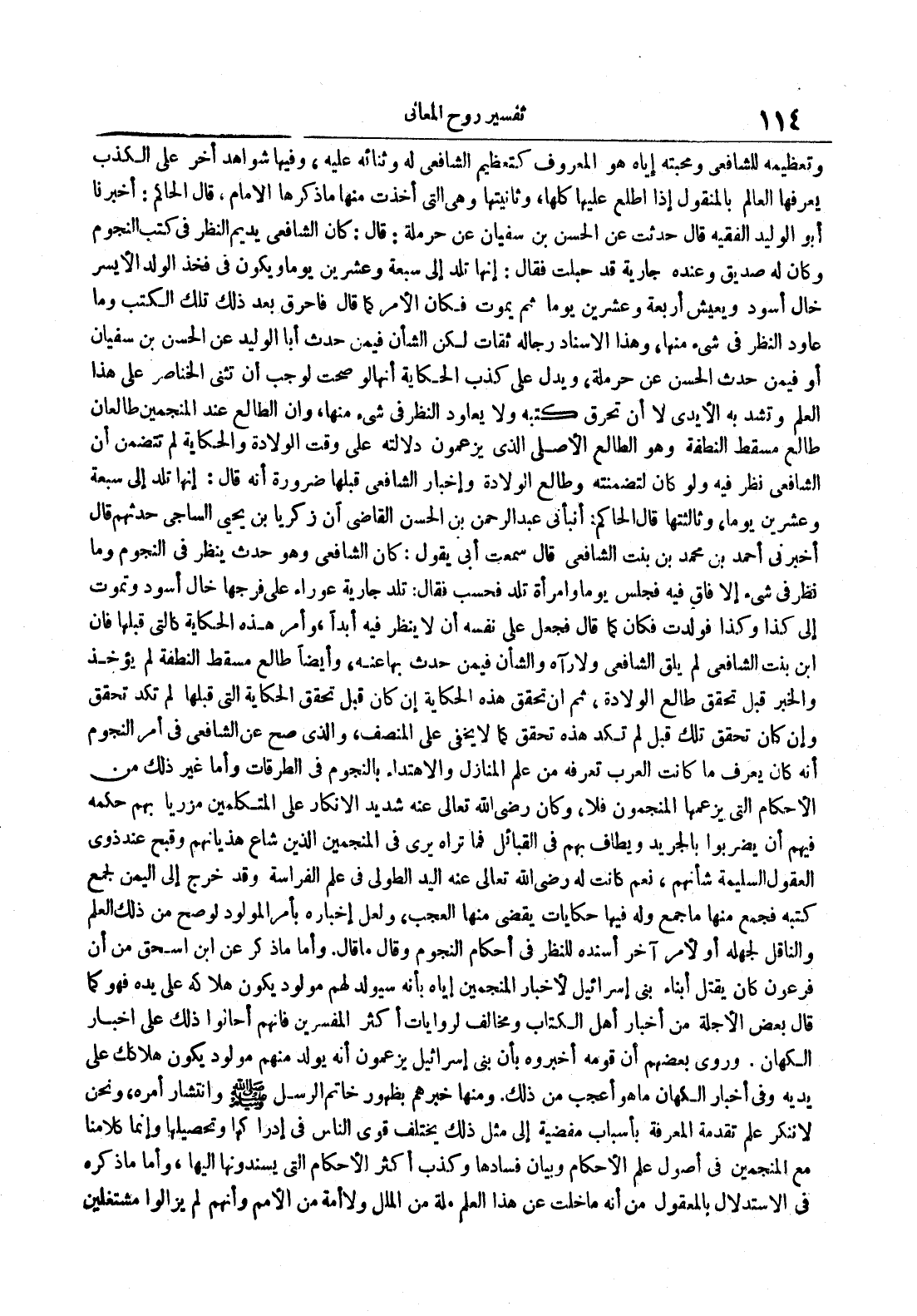 وتعظيمه للشافعي ومحبته إياه هو المعروف كتعظيم الشافعي له وثنائه عليه وفيها شواهد أخر على الكذب يعرفها العالم بالمنقول إذا اطلع عليها كلها وثانيتها وهي التي أخذت منها ما ذكرها الإمام قال الحاكم : أخبرنا أبو الوليد الفقيه قال حدثت عن الحسن بن سفيان عن حرملة : قال : كان الشافعي يديم النظر في كتب النجوم وكان له صديق وعنده جارية قد حلبت فقال : إنها تلد إلي سبعة وعشرين يوما ويكون في فخد الولد الأيسر خال أسود ويعيش أربعة وعشرين يوما ثم يموت فكان الأمر كما قال فأحرق بعد ذلك تلك الكتب وما عاود النظر في شيء منها وهذا الإسناد رجاله ثقات لكن الشأن فيمن حدث أبا الوليد عن الحسن بن سفيان أو فيمن حدث الحسن عن حرملة ويدل على كذب الحكاية أنها لو صحت لوجب أن تثني الخناصر على هذا العلم وتشد الأيدي لا أن تحرق كتبه ولا يعاود النظر في شيء منها وإن الطالع عند المنجمين طالعان طالع مسقط المطفة وهو الطالع الأصلي الذي يزعمون دلالته على وقت الولادة والحكاية لم تتضمن أن الشافعي نظر فيه ولو كان لتضمنه وطالع الولادة وإخبار الشافعي قبلها ضرورة أنه قال : إنها تلد إلى سبعة وعشرين يوما وثالثتها قال الحاكم : أنبأني عبد الرحمن بن الحسن القاضي أن زكريا بن يحيى الساجي حدثهم قال أخبرني أحمد بن محمد بن بنت الشافعي قال سمعت أبي يقول : كان الشافعي وهو حدث ينظر في النجوم وما نظر في شيء إلا فاق فيه فجلس يوما وامرأة تلد فحسب فقال : تلد جارية عوراء على فرجها خال أسود وتموت إلى كذا وكذا فولدت فكان كما قال فجعل على نفسه أن لا ينظر فيه أبدا وأمر هذه الحكاية كالتي قبلها فإن ابن بنت الشافعي لم يلق الشافعي ولا رآه والشأن فيمن حدث بها عنه وأيضا طالع مسقط النطفة لم يؤخذ والخبر قبل تحقق طالع الولادة ثم إن هذه الحكاية إن كان قبل تحقق الحكاية التي قبلها لم تكد تحقق وإن كان تحقق تلك قبل لم تكد هذه تحقق كما لا يخفى على المنصف والذي صح عن الشافعي في أمر النجوم أنه كان يعرف ما كانت العرب تعرفه من علم المنازل والإهتداء بالنجوم في الطرقات وأما غير ذلك من الأحكام التي يزعمها المنجمون فلا وكان رضي الله تعالى عنه شديد الإنكار على المتكلمين مزريا بهم حكمه فيهم أن يضربوا بالجريد ويطاف بهم في القبائل فما تراه في المنجمين الذين شاع هذيانهم وقبح عند ذوي العفول السليمة شأنهم نعم كانت له رضي الله تعالى عنه اليد الطولى في علم الفراسة وقد خرج إلى اليمن لجمع كتبه منها ما جمع وله فيها حكايات يقضي منها العجب ولعل إخباره بأمر المولود لو صح من ذلك العلم والناقل لجهله أو لأمر آخر أسنده للنظر في أحكام النجوم وقال ما قال وأما ما ذكر عن ابن إسحاق من أن فرعون كان يقتل أبناء بني إسرائيل لأخبار المنجمين إياه بأنه سيولد لهم مولود يكون هلاكه على يده فهو كما قال بعض الأجلة من أخبار أهل الكتاب ومخالف لروايات أكثر المفسرين فإنهم أحالوا ذلك على إخبار الكهان وروي بعضهم أن قومه أخبروه بأن بني إسرائيل يزعمون أنه يولد منهم مولود يكون هلاكك على يديه وفي أخبار الكهعان ما هو أعجب من ذلك ومنها خبرهم بظهور خاتم الرسل صلى الله عليه و سلم وانتشار أمره ونحن لا ننكر على تقدمة المعرفة بأسباب مفضية إلى مثل ذلك يختلف قوى الناس في إدراكها وتحصيلها وإنما كلامنا مع المنجمين في أصول علم الأحكام وبيان فسادها وكذب أكثر الأحكام التي يسندونها إليها وأما ما ذكره في الإستدلال بالمعقول من أنه ما خلت عن هذا العلم ملة من الملل ولا أمة من الأمم وأنهم لم يزالوا مشتغلين