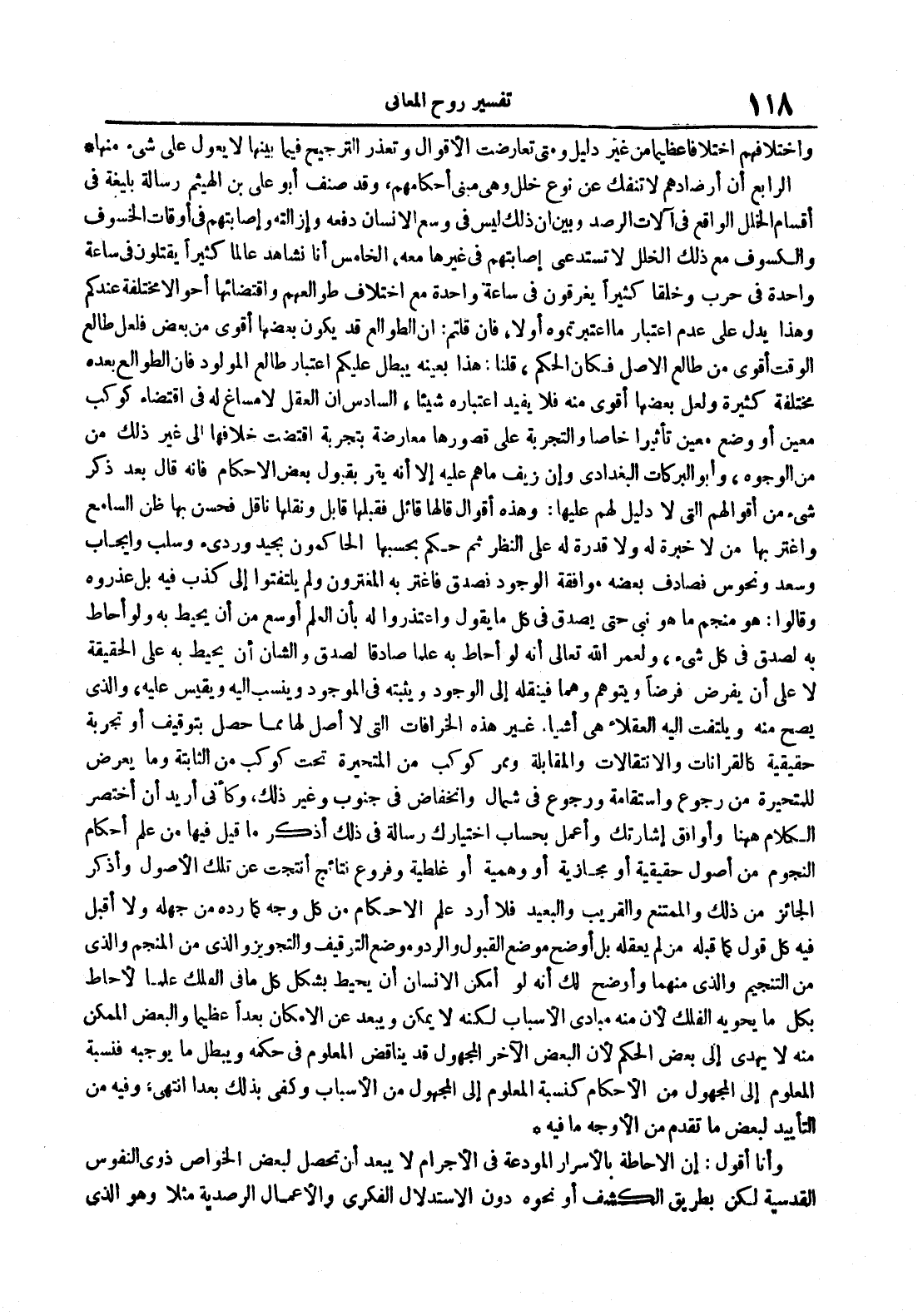 الرابع أن أرصادهم لا تنفك عن نوع خلل وهي مبنى أحكامهم وقد صنف أبو علي بن الهيثم رسالة بليغة في أقسام الخلل الواقع في آلات الرصد وبين أن ذلك ليس في وسع الإنسان دفعه وإزالته وإصابتهم في أوقات الخسوف والكسوف مع ذلك الخلل لا تستدعي إصابتهم في غيرها معه الخامس أنا نشاهد عالما كثيرا يقتلون في ساعة واحدة في حرب وخلقا كثيرا يغرقون في ساعة واحدة مع اختلاف طوالعهم واقتضائها أحوالا مختلفة عندكم وهذا يدل على عدم اعتبار ما اعتبرتموه أولا فإن قلتم : إن الطوالع قد يكون بعضها أقوى من بعض فلعل طالع الوقت أقوى من طالع الأصل فكان الحكم قلنا : هذا بعينه يبطل عليكم اعتبار طالع المولود فإن الطوالع بعده مختلفة ولعل بعضها أقوى منه فلا يفيد اعتباره شيئا السادس أن العقل لا مساغ له في اقتضاء كوكب معين أو وضع معين تأثيرا خاصا والتجربة على قصورها معارضة بتجربة اقتضت خلافها إلى غير ذلك من الوجوه وأبو البركات البغدادي وإن زيف ما هم عليه إلا أنه يقر بقبول بعض الأحكام فإنه قال بعد ذكر شيء من أقوالهم التي لا دليل لهم عليها : وهذه أقوال قالها قائل فقبلها قابل ونقلها ناقل فحسن بها ظن السامع واغتر بها من لا خبرة له ولا قدرة له على النظر ثم حكم حسبها الحاكمون بجيد ورديء وسلب وإيجاب وسعد ونحوس فصادف بعضه موافقة الوجود فصدق فاغتر به المغترون ولم يلتفتوا إلى كذب فيه بل عذروه وقالوا : هو منجم ما هو نبي حتى يصدق في كل ما يقول واعتذروا له بأن العلم أوسع من أن يحيط به ولو أحاط به لصدق في كل شيء ولعمر الله تعالى أنه لو أحاط به علما صادقا لصدق والشأن أن يحيط به على الحقيقة لا على أن يفرض فرضا ويتوهم وهما فينقله إلى الوجود ويثبته في الموجود وينسب إليه ويقيس عليه وبالذي يصح منه ويلتفت إليه العقلاء هي أشياء غير هذه الخرافات التي لا أصل لها مما حصل بتوقيف أو تجربة حقيقة كالقرانات والإنتقالات والمقابلة وممر كوكب من المتحيرة تحت كوكب من الثابتة وما يعرض للمتحيرة من رجوع واستقامة ورجوع في شمال وانخفاض في جنوب وغير ذلك وكأني أريد أن أختصر الكلام ههنا وأوافق إشارتك وأعمل بحساب اختيارك رسالة في ذلك أذكر ما قيل فيها من علم أحكام النجوم من أصول حقيقية أو مجازية أو وهمية أو غلطية وفروع نتائج أنتجت عن تلك الأصول وأذكر الجائز من ذلك والممتنع والقريب والبعيد فلا أرد علم الأحكام من كل وجه كما رده من جهله ولا أقبل فيه كل قول كما قبله من لم يعقله بل أوضح القبول والرد وموضع الترقبف والتجويز والذي من المنجم والذي من التنجيم والذي منهما وأوضح لك أنه لو أمكن الإنسان أن يحيط بشكل كل ما في الفلك علما لأحاط بكل ما يحويه الفلك لأن منه مباديء الأسباب لكنه لا يمكن ويبعد عن الإمكان بعدا عظيما والبعض الممكن منه لا يهدي إلى بعض الحكم لأن البعض الآخر المجهول قد يناقض المعلوم في حكمه ويبطل ما يوجبه فنسبة المعلوم إلى الكجهول من الأحكام كنسبة المعلوم إلى المجهول من الأسباب وكفى بذلك بعدا انتهى وفيه من التأييد لبعض ما تقدم من الأوجه ما فيه