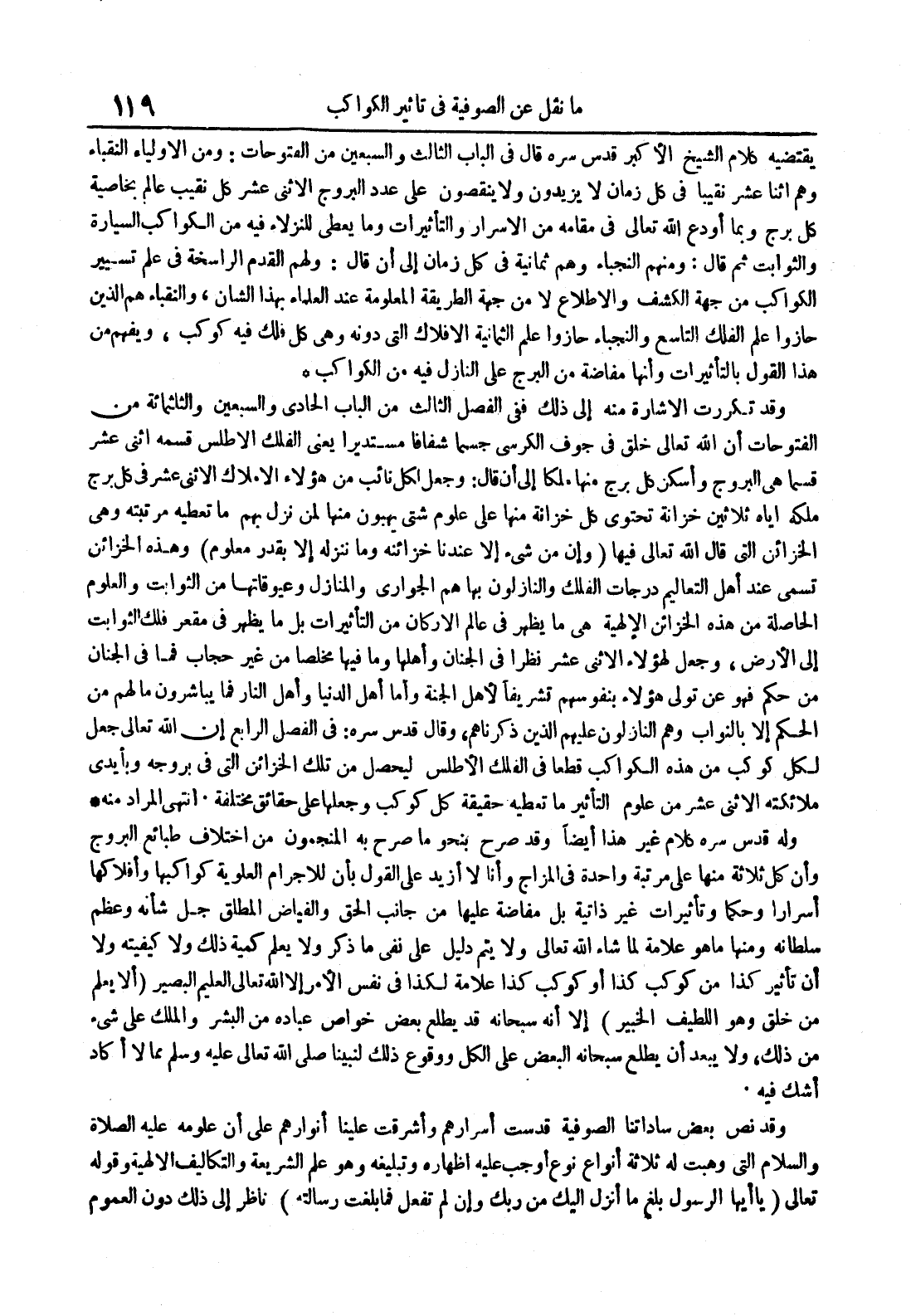 وله قدس سره كلام غير هذا أيضا وقد صرح بنحو ما صرح به المنجمون من اختلاف طبائع البروج وأن كل ثلاثة منها على مرتبة واحدة في المزاج وأنا لا أزيد على القول بأن للأجرام العلوية كواكبها وأفلاكها أسرارا وحكما وتأثيرات غير ذاتية بل مفاضلة عليها من جانب الحق والفياض المطلق جل شأنه وعظم سلطانه ومنها ما هو علامة لما شاء الله تعالى ولا يتم دليل على نفي ما ذكر ولا يعلم كمية ذلك ولا كيفيته ولا أن تأثير كذا من كوكب كذا أو كوكب كذا علامة لكذا في نفس الأمر إلا الله تعالى العليم البصير ألا يعلم من خلق وهو اللطيف الخبير إلا أنه سبحانه قد يطلع بعض خواص عباده من البشر والملك على شيء من ذلك ولا يبعد أن يطلع سبحانه البعض على الكل ووقوع ذلك لنبينا صلى الله تعالى عليه وسلم مما لا أكاد أشك فيه وقد نص بعض ساداتنا الصوفية قدست أسرارهم وأشرقت علينا أنوارهم على أن علومه عليه الصلاة و السلام التي وهبت له ثلاثة أنواع نوع أوجب عليه إظهاره وتبليغه وهو علم الشريعة والتكاليف الإلهية وقوله تعالى يا أيها الرسول بلغ ما أنزل إليك من ربك وإن لم تفعل فما بلغت رسالته ناظر إلى ذلك دون العموم