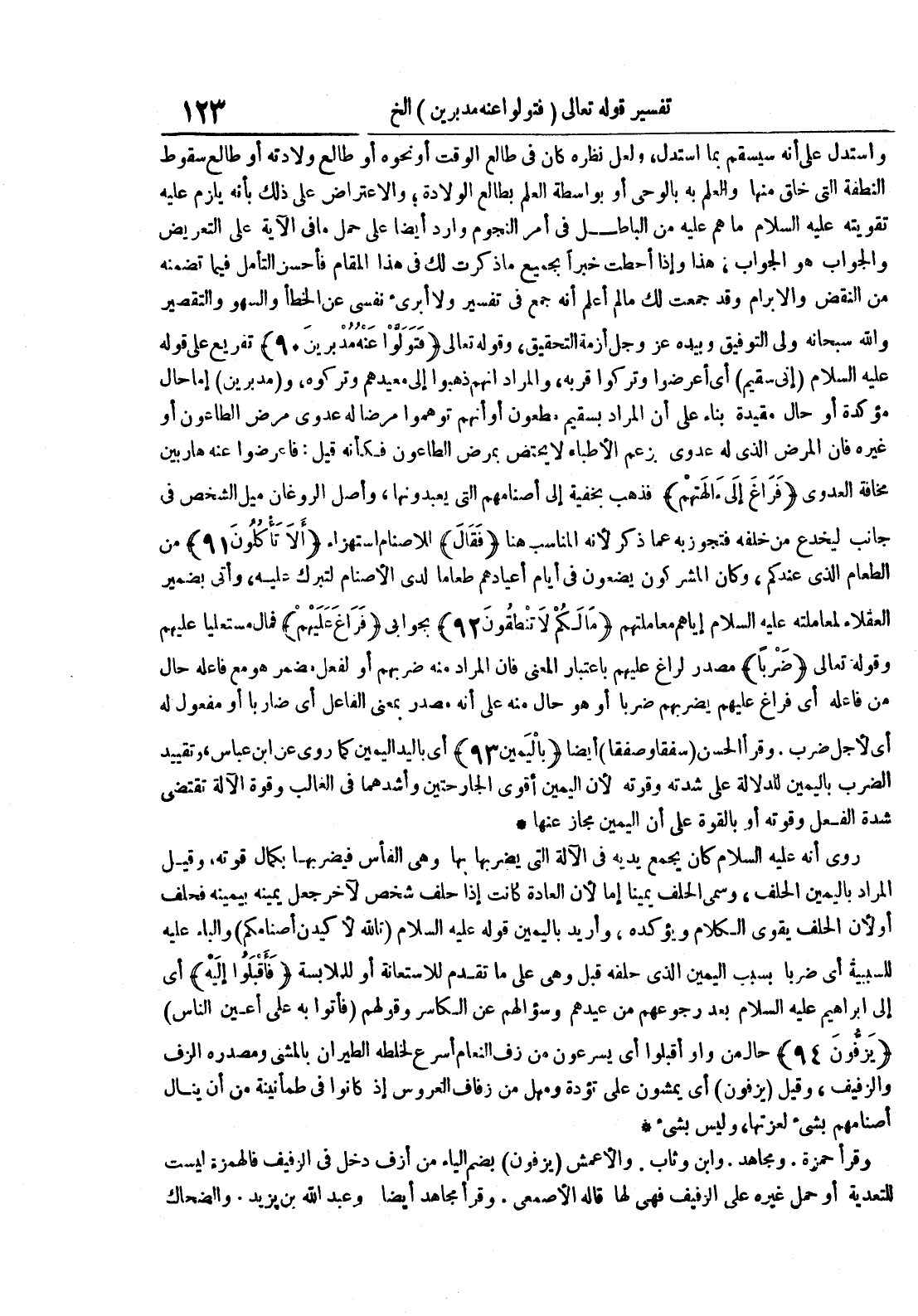 - بجوابي فراغ عليهم فمال مستعليا عليهم وقوله تعالى ضربا مصدر لراغ عليهم باعتبار المعنى فإن أراد منه ضربهم أو لفعل مضمر هو مع فاعله حال من فاعله أي فراغ عليهم يضربهم ضربا أو هو حال منه على أنه مصدر بمعنى الفاعل أي ضاربا أو مفعول له أي لأجل ضرب وقرأ الحسن سفقا صفقا أيضا باليمين