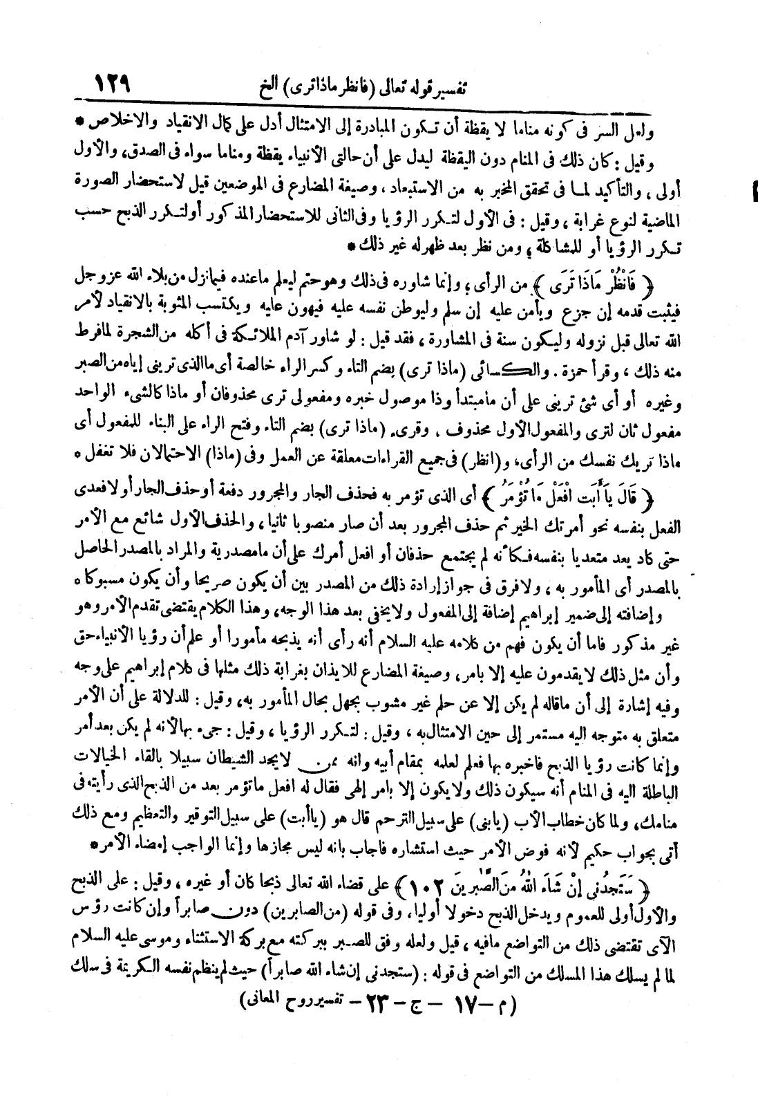 - على قضاء الله تعالى ذبحا كان أو غيره وقيل على الذبح والأول أولى للعموم ويدخل الذبح دخولا أوليا وفي قوله من الصابرين دون صابرا وإن كانت رؤس الآي تقتضي ذلك من التواضع ما فيه قيل ولعله وفق للصبر ببركته مع بركة الإستثناء وموسى عليه السلام لما لم يسلك هذا المسلك من التواضع في قوله : ستجدني إن شاء الله صابرا حيث لم ينظم نفسه الكريمة في سلك