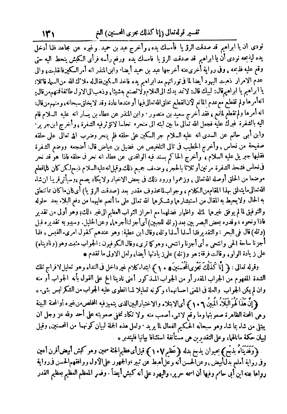 نودي أن يا إبراهيم قد صدقت الرؤيا فأمسك يده وأخرج عبد بن حميد وغيره عن مجاهد فلما أدخل يده ليذبحه نودي أن يا إبراهيم قد صدقت الرؤيا فأمسك يده ورفع رأسه فرأى الكبش ينحط إليه حتى وقع عليه فذبحه وفي رواية أخرى عنه أخرجها عبد بن حميد أيضا وابن المنذر أنه أمر السكين فانقلبت وإلى عدم الإمرار ذهبت اليهود أيضا لما في توراتهم مد إبراهيم يده فأخذ السكين فقال له ملأك الله من السماء قائلا : يا إبراهيم يا إبراهيم قال : لبيك قال : لا تمد يدك إلى الغلام ولا تصنع به شيئا وذهب إلى الأول طائفة من قال : أنه آمرها ولم تقطع مع عدم المانع لأن القطع بخلق الله تعالى فيها أو عندها عادة وقد لا يخلق سبحانه ومنهم من قال : أنه أمرها ولم تقطع لمانع فقد أخرج سعيد بن منصور وابن المنذر عن عطاء بن يسار أنه عليه السلام قام إليه بالشفرة فبرك عليه فجعل الله تعالى ما بين لبته إلى منحره نحاسا لا تؤثر فيه الشفرة وأخرج ابن جرير وابن أبي حاتم عن السدي أنه عليه السلام جر السكين على حلقه فلم ينحر وضرب الله تعالى على حلقه صفيحة من نحاس وأخرج الخطيب في تالي التلخيص عن فضيل بن عياض قال : أضجعه ووضع الشفرة فقلبها جبريل عليه السلام وأخرج الحاكم بسند فيه الواقدي عن عطاء أنه نحر في حلقه فإذا هو قد نحر في نحاس فشحذ الشفرة مرتين أو ثلاثا بالحجر وضعف جميع ذلم وقيل أنه عليه السلام ذبح لكن كان كلما قطع موضعا من الحلق أوصله الله تعالى وزعموا ورود ذلك في بعض الأخبار ولا يكاد يصح وسيأتي قريبا إن شاء الله تعالى ما يتعلق بهذا المقام من الكلام وجواب لما محذوف مقدر بعد صدقت الرؤيا أي كان ما كان مما تنطق به الحال ولا يحيط به المقال من استبشارهما وشكرهما الله تعالى على ما أنعم عليهما من دفع البلاء بعد حلوله والتوفيق لما لم يوفق غيرهما لمثله وإظهار فضلهما مع إحراز الثواب العظيم إلى غير ذلك وهو أولى من تقدير فإذا ونحوه وقدره بعض البصريين بعد وتله للجبين أي أجزلنا أجرهما وعن الخليل وسيبويه تقديره قبل وتله قال في البحر : والتقدير فلما أسلما أسلما وتله وقال ابن عطية : وهو عندهم كقول امريء القيس