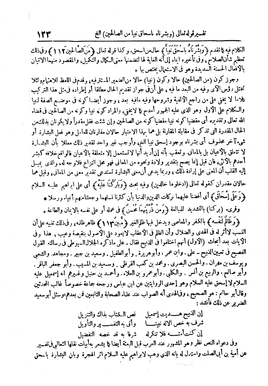 - ظاهر ظلمه وفي ذلك تنبيه على أن النسب لا أثر له في الهدى والضلال وأن الظلم في الأعقاب لا يعود على الأصول بنقيصة وعيب هذا وفي الآيات بعد أبحاث الأول أنهم اختلفوا في الذبيح فقال على ما ذكره الجلال السيوطي في رسالته القول الفصيح في تعيين الذبيح علي وابن عمر وأبو هريرة وأبو الطفيل وسعيد بن جبير ومجاهد والشعبي ويوسف بن مهران والحسن البصرين ومحمد بن كعب القرظي وسعيد بن المسيب وأبو جعفر الباقر وأبو صالح والربيع بن أنس والكلبي وأبو عمرو بن العلاء وأحمد بن حنبل وغيرهم أنه إسماعيل عليه السلام لا إسحاق عليه السلام وهو إحدى الروايتين عن ابن عباس ورجحه جماعة خصوصا غالب المحدثين وقال أبو حاتم : هو الصحيح وفي الهدى أنه الصواب عند علماء الصحابة والتابعين فمن بعدهم وسئل أبو سعيد الضرير عن ذلك فأنشد : إن الذبيح هديت إسماعيل نص الكتاب بذاك والتنزيل شرف به خص الإله نبينا وأتى به التفسير والتأويل إن كنت أمته فلا تنكر له شرفا به قد خصه التفضيل وفي دعواه النص نظر وهو المشهور عند العرب قبل البعثة أيضا كما يشعر به أبيات نقلها الثعالبي في تفسير عن أمية بن أبي الصلت واستدل له بأنه الذي وهب لإبراهيم عليه