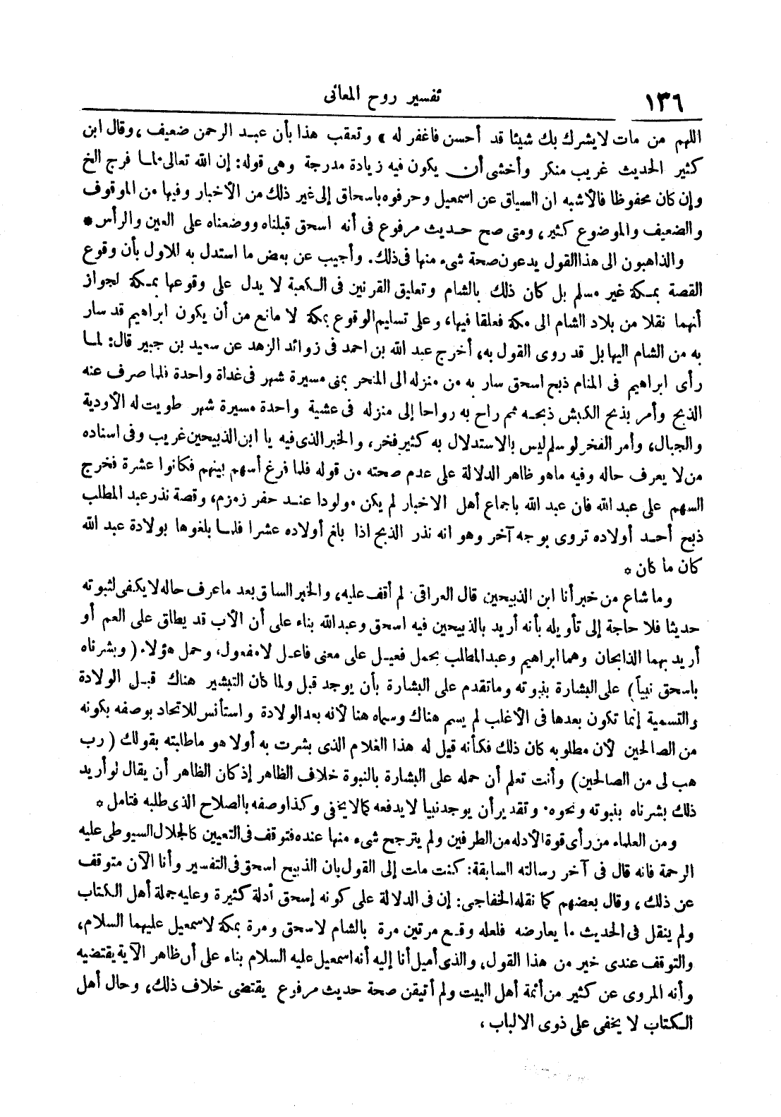 اللهم من مات لا يشرك بك شيئا قد أحسن فاغفر له وتعقب هذا بأن عبد الرحمن ضعيف وقال ابن كثير الحديث عريب منكر وأخشى أن يكون فيه زيادة مدرجة وهي قوله : إن الله تعالى لما فرج الخ وإن كان محفوظا فالأشبه إن السياق عن إسماعيل وحرفوه بإسحاق إلى غير ذلك من الأخبار وفيها من الموقوف والضعيف والموضوع كثير ومتى صح حديث مرفوع في أنه إسحاق قبلناه ووضعناه على العين والرأس