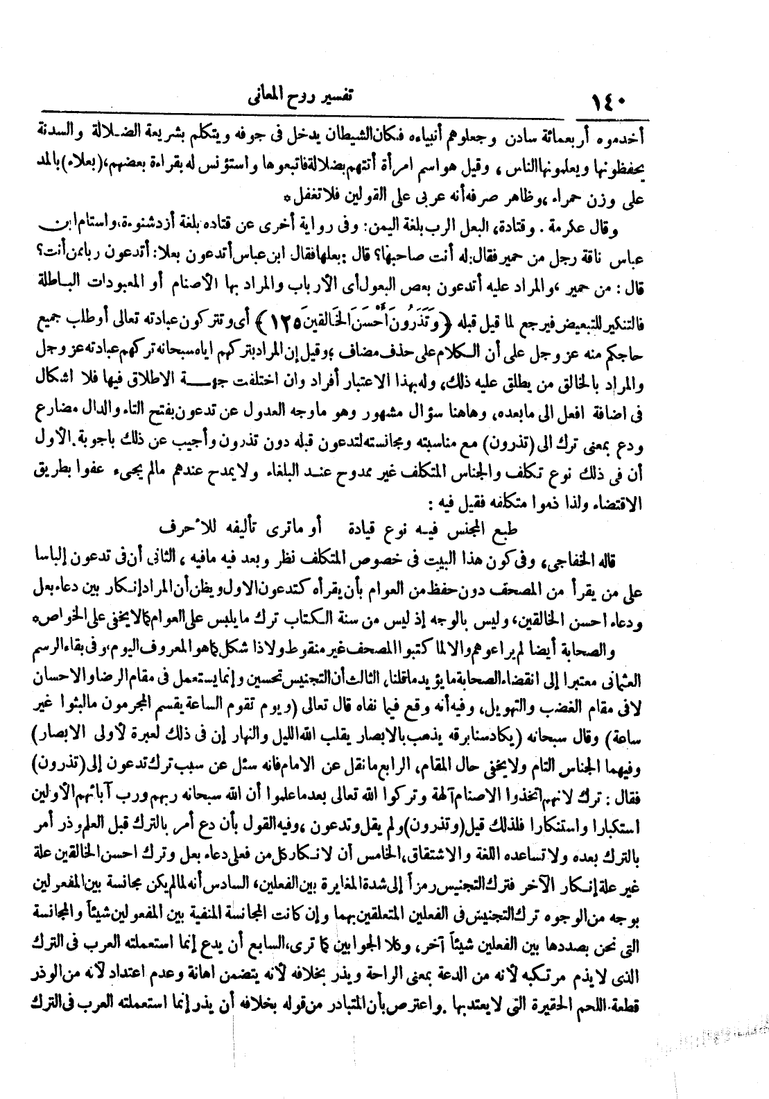 - أي وتتركون عبادته تعالى أو طلب جميع حاجكم منه عز و جل على أن الكلام على حذف مضاف وقيل إن المراد بتركهم إياه سبحانه تركهم عباده عز و جل والمراد بالخالق من يطلق عليه ذلك وله بهذا الإعتبار أفراد وأن اختلفت جهة الإطلاق فيها فلا إشكال في أضافة أفعل إلى ما بعده وها هنا سؤال مشهور وهو ما وجه العدول عن تدعون بفتح التاء والدال مضارع ودع بمعنى ترك تذرون مع مناسبته ومجانسته لتدعون قبله دون تذرون وأجيب عن ذلك بأجوبة الأول أن في ذلك نوع تكلف والجناس المتكلف غير ممدوح عند البلغاء ولا يمدح عندهم مالم يجيء عفوا بطريق الإقتضاء ولذا ذموا متكلفه فقيل فيه : طبع المجنس فيه نوع قيادة أو ما ترى تأليفه للأحرف قاله الخفاجي وفي كون هذا البيت في خصوص المتكلف نظر وبعد فيه ما فيه الثاني أن في تدعون إلباسا على من يقرأ من المصحف دون حفظ من العوام بأن يقرأه كتدعون الأول ويظن أن المراد إنكار بين دعاء بعمل ودعاء أحسن الخالقين وليس بالوجه إذ ليس من سنة الكتاب ترك ما ليس على العوام كما لا يخفى على الخواص