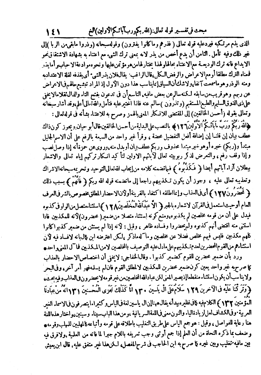 - استثناء متصل من الواو في كذبوه فيدل على أن من قومه مخلصين لم يكذبوه ومنه كونه استثناء من ضمير محضرون لأنه للمكذبين فإذا استثنى منه اقتضى أنهم كذبوه ولم يحضروا وفساده ظاهر وقيل : لأنه إذا لم يستثن من ضمير كذبوا كانوا كلهم مكذبين فليس فيهم مخلص فضلا عن مخلصين ومآله ما ذكر لكن اعترضه ابن كمال بأنه لا فساد فيه لأن استثناءهم من القوم المحضرين لعدم تكذيبهم على ما دل عليه التوصيف بالمخلصين لا من المكذبين فمآل المعنى واحد