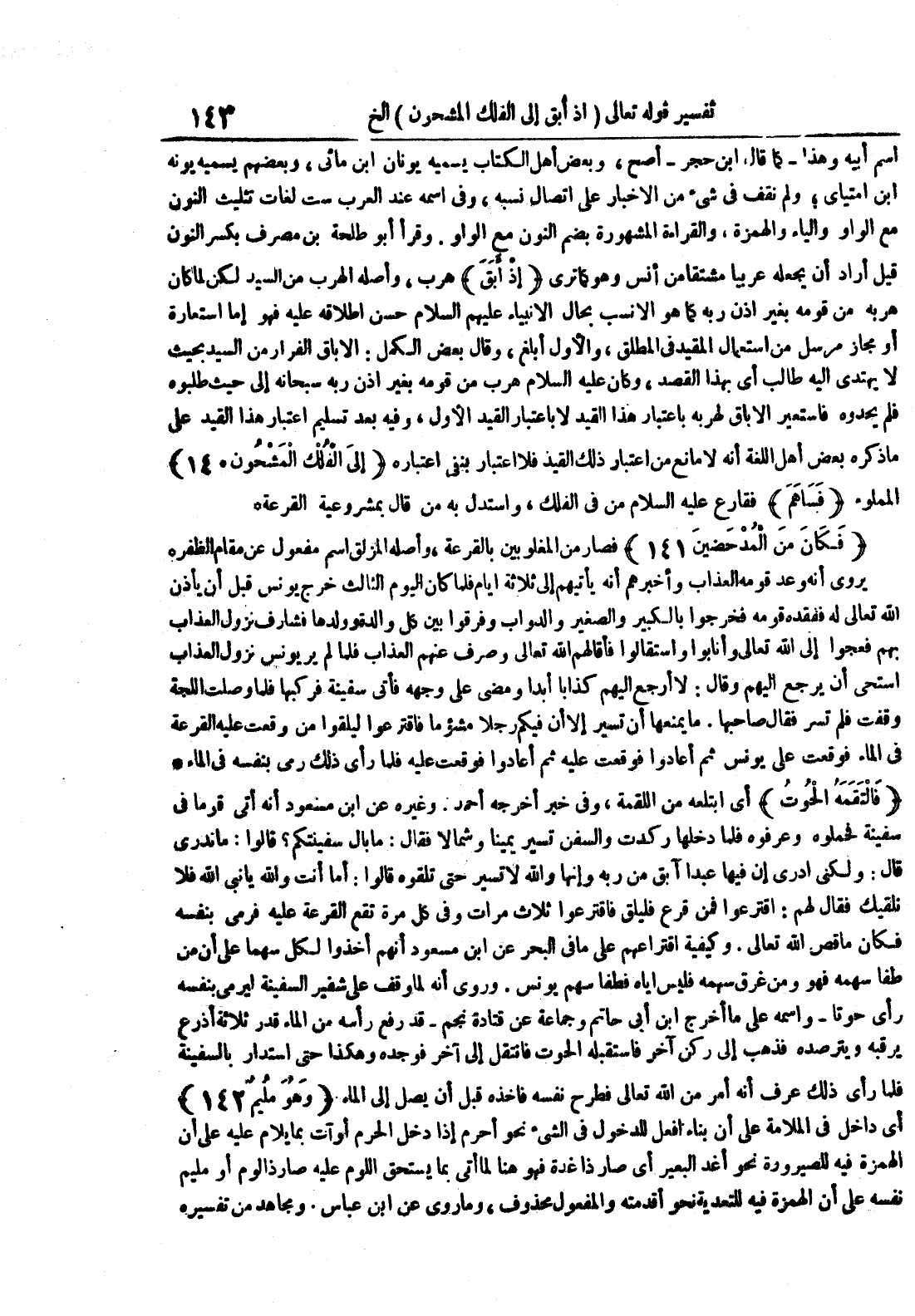 اسم أبيه وهذا كما قال ابن حجر أصح وبعض أهل الكتاب يسميه يونان ابن ماثي وبعضهم يسميه يونه ابن امتيازي ولم نقف في شيء من الأخبار على اتصال نسبه وفي اسمه عند العرب ست لغات تثليت النون مع الواو والياء والهمزة والقراءة المشهورة بضم النون مع الواو وقرأ أبو طلحة بن مصرف بكسر النون قيل أراد أن يجعله عربيا مشتقا من أنس وهو كما ترى إذ أبق هرب وأصله الهرب من السيد لكن لما كان هربه من قومه بغير إذن ربه كما هو الأنسب بحال الأنبياء عليهم السلام حسن إطلاقه عليه فهو إما ستعارة أو مجاز مرسل من استعمال المقيد في المطلق والأول أبلغ وقال بعض الكمل : الإباق الفرار من السيد بحيث لا يهتدي إليه طالب أي بهذا القصد وكان عليه السلام هرب من قومه بغير إذن ربه سبحانه إلى حيث طلبوه فلم يجدوه فاستعير الإباق لهربه باعتبار هذا القيد لا باعتبار القيد الأول وفيه بعد تسلم اعتبار هذا القيد على ما ذكره بعض أهل اللغة أنه لا مانع من اعتبار ذلك القيد فلا اعتبار بنفي اعتباره إلى الفلك المشحون