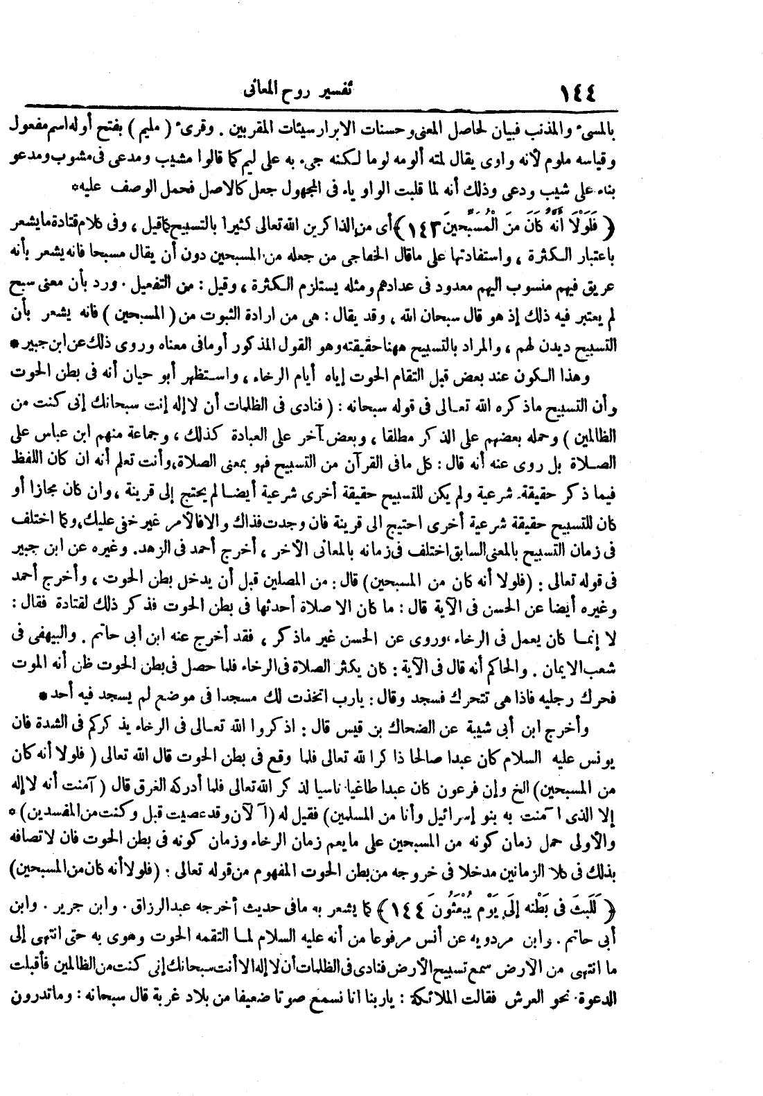 - أي من الذاكرين الله تعالى كثيرا بالتسبيح كما قيل وفي كلام قتادة ما يشعر باعتباره الكثرة واستفادتها على ما قال الخفاجي من جعله من المسبحين دون أن يقال مسبحا فإنه يشعر بأنه عريق فيهم منسوب إليهم معدود في عدادهم ومثله يستلزم الكثرة وقيل : من التفعيل ورد بأن معنى سبح لم يعتبر فيه ذلك إذ هو قال سبحانه الله وقد يقال : هي من إرادة الثبوت من المسبحين فإنه يشعر بأن التسبيح ديدن لهم والمراد بالتسبيح ههنا حقيقته وهو القول المذكور أو ما في معناه وروي ذلك عن ابن جبير