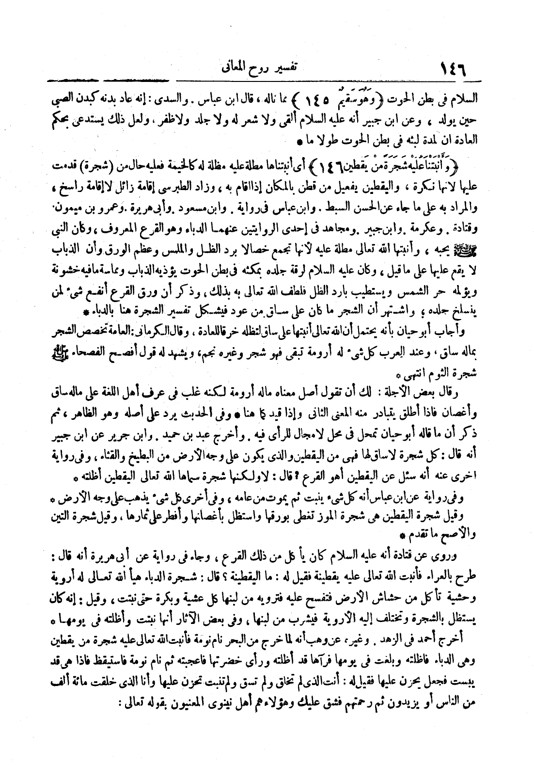 - أي أنبتناها مطلة عليه مظلة له كالخيمة فعليه حال من شجرة قدمت عليها لأنها نكرة واليقطين يفعيل من قطن بالمكان إذا أقام به وزاد الطبرسي إقامة زائل لا إقامة راسخ والمراد به على ما جاء عن الحسن السبط وابن عباس في رواية وابن مسعود وأبي هريرة وعمرو بن ميمون وقتادة وعكرمة وابن جبير ومجاهد في إحدى الروايتين عنهما الدباء وهو القرع المعروف وكان النبي صلى الله عليه و سلم يحبه وأنبتها الله تعالى مطلة عليه لأنها تجمع خصالا برد الظل والملمس وعظم الورق وأن الذباب لا يقع عليها على ما قيل وكان عليه السلام لرقة جلده بمكثه في بطن الحوت يؤذيه الذباب ومماسة ما فيه خشونة ويؤلمه حر الشمس ويستطيب بارد الظل فلطف الله تعالى به بذلك وذكر أن ورق القرع أنفع شيء لمن ينسلخ جلده واشتهر أن الشجر ما كان على ساق من عود فيشكل تفسير الشجرة هنا بالدباء