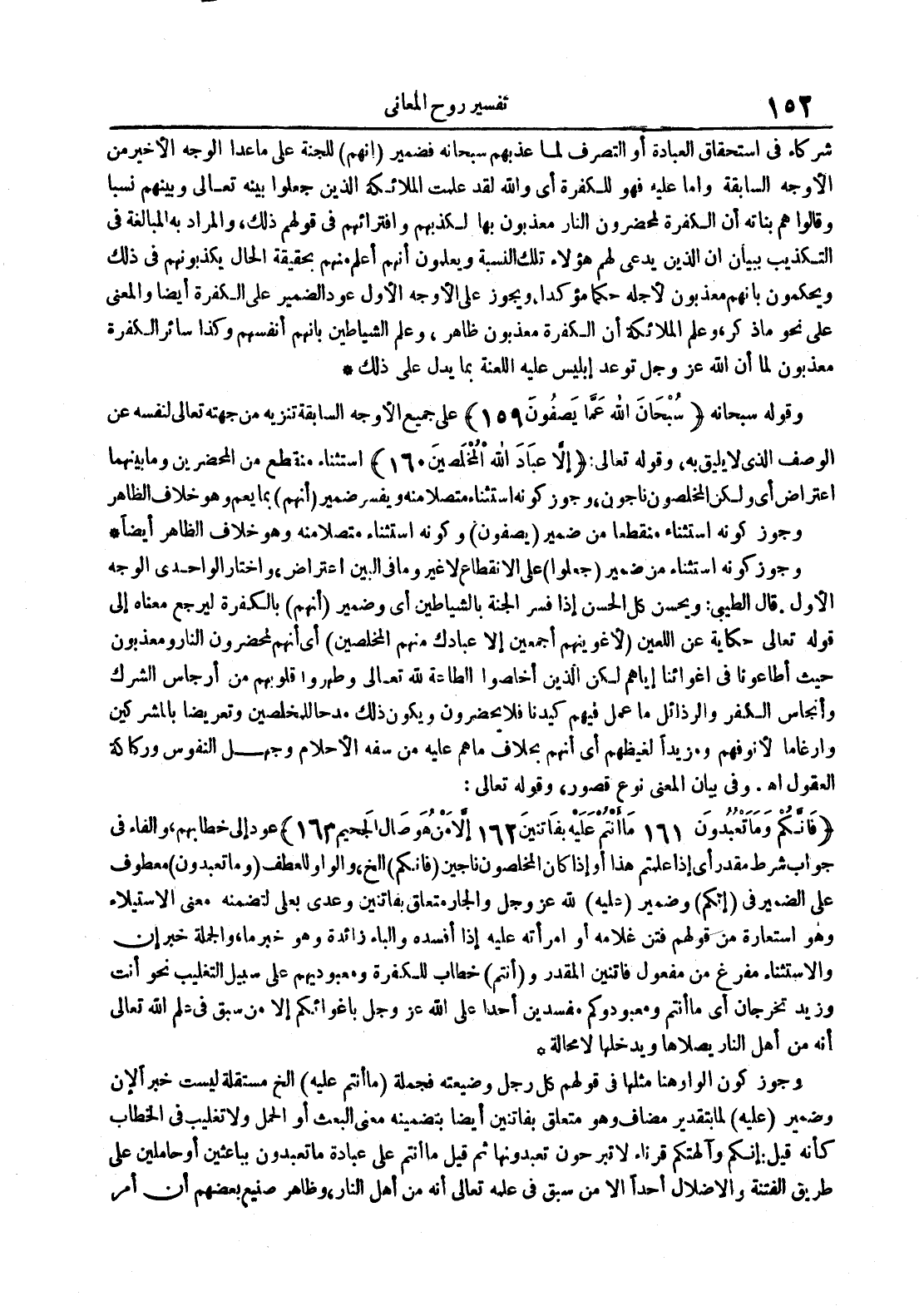 - استثناء منقطع من المحضرين وما بينهما اعتراض أي ولكن المخلصون ناجون وجوز كونه استثناء متصلا منه ويفسر ضمير أنهم بما يعم وهو خلاف الظاهر وجوز كونه استثناء منقطعا من ضمير يصفون وكونه استثناء متصلا منه وهو خلاف الظاهر أيضا