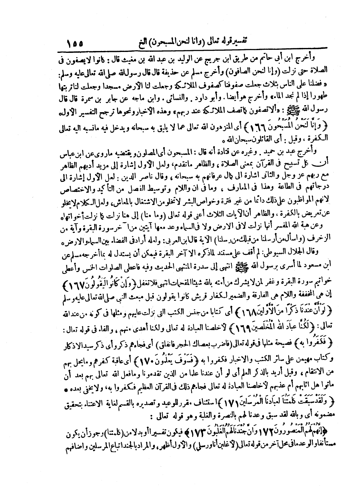 وأخرج عبد بن حميد وغيره عن قتادة أنه قال : المسبحون أي المصلون ويقتضيه ما روي عن ابن عباس أن كل تسبيح في القرآن بمعنى الصلاة والظاهر ما تقدم ولعل الأول إشارة إلى مزيد أدبهم الظاهر مع ربهم عز و جل والثاني إشارة إلى كمال عرفانهم به سبحانه وقال ناصر الدين : لعل الأول إشارة إلى درجاتهم في الطاعة وهذا في المعارف وما في أن واللام وتوسيط الفصل من التأكيد والإختصاص لأنهم المواظبون على ذلك دائما من غير فترة واخواص البشر لا تخلو من الإشتغال بالمعاش ولعل الكلام لا يخلو عن تعريض بالكفرة والظاهر أن الآيات الثلاث أعني قوله تعالى وما منا إلى هنا نزلت أخواتها