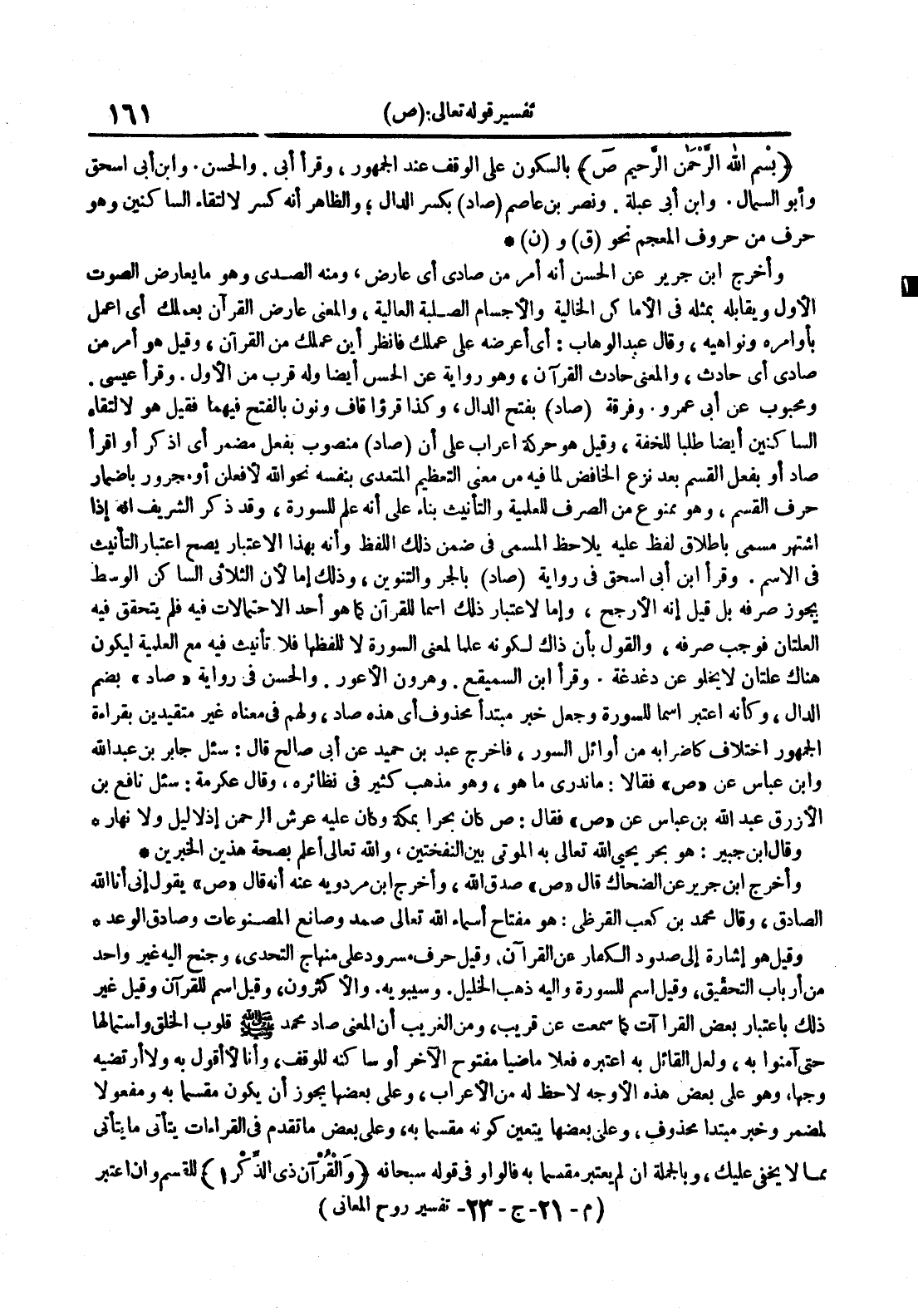 وأخرج ابن جرير عن الحسن أنه أمر من صادي أي عارض ومنه الصدى وهو ما يعارض الصوت الأول ويقابله بمثله في الأماكن الخالية والأجسام الصلبة العالية والمعنى عارض القرآن بعملك أي اعمل بأوامره نواهيه وقال عبد الوهاب : أي أعرضه عن عملك فانظر أين عملك من القرآن وقيل هو أمر من صادي أي حادث والمعنى حادث القرآن وهو رواية عن الحس أيضا وله قرب من الأول وقرأ عيسى ومحبوب عن أبي عمرو وفرقة صاد بفتح الدال وكذا قرؤا قاف ونون بالفتح فيهما فقيل هو لالتقاء الساكنين أيضا طلبا للخفة وقيل هو حركو إراب على أن صاد منصوب بفعل مضمر أي اذكر أو اقرأ صاد أو بفعل القسم بعد نزع الخافض لما فيه من معنى التعظيم المتعدي بنفسه نحو الله لأفعلن أو مجرور بإضمار حرف القسم وهو ممنوع من الصرف للعلمية والتأنيث بناء على أنه علم للسورة وقد ذكر الشريف أنه إذا اشتهر مسمى بإطلاق لفظ عليه يلاحظ المسمى في ضمن ذلك اللفظ وأنه بهذا الإعتبار يصح اعتبار التأنيث في الاسم وقرأ ابن أبي إسحاق في رواية صاد بالجر والتنوين وذلك إما لأن الثلاثي الساكن الوسط يجوز صرفه بل قيل إنه الأرجح وإما لاعتبار ذلك اسما للقرآن كما هو أحد الإحتمالات فيه فلم يتحقق فيه العلتان فوجب صرفه والقول بأن ذاك لكونه علما لمعنى السورة لا للفظها فلا تأنيث فيه مع العلمية ليكون هناك علتان لا يخلو عن دغدغة وقرأ ابن السمقيع وهارون الأعور والحسن في رواية صاد بضم الدال وكأنه اعتبر اسما للسورة وجعل خبر مبتدأ محذوف أي هذه صاد ولهم في معناه غير متقيدين بقراءة الجمهور اختلاف كإضرابه من أوائل السور فأخرج عبد بن حميد عن أبي صالح قال : سئل جابر بن عبد الله وابن عباس عن ص فقالا : ما ندري ما هو وهو مذهب كثير في نظائره وقال عكرمة : سئل نافع بن الأزرق عبد الله بن عباس عن